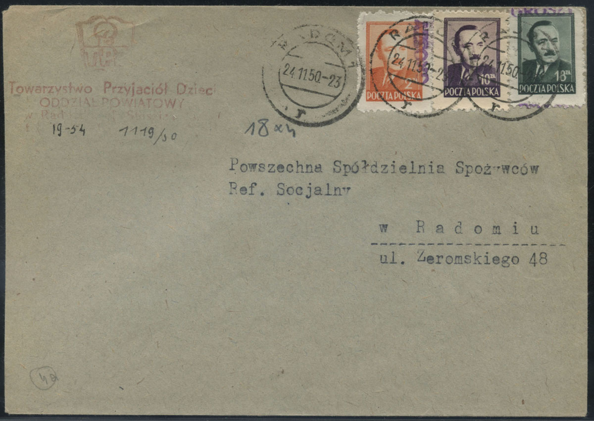 1950 groszy, list miejscowy z Radomia opłacony znaczkami z nadrukiem groszy typ 4 w barwie fioletowej. | Fi.470, 474, 476 |