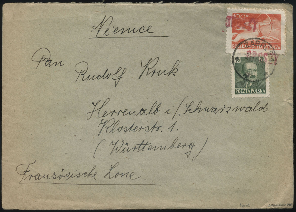 1950 groszy, list Zabrza nadany 8.11.50 do Niemiec opłacony znaczkami z nadrukiem groszy typ 3C w barwie czerwonej, gwarancja Walocha. | Fi.449, 519 |