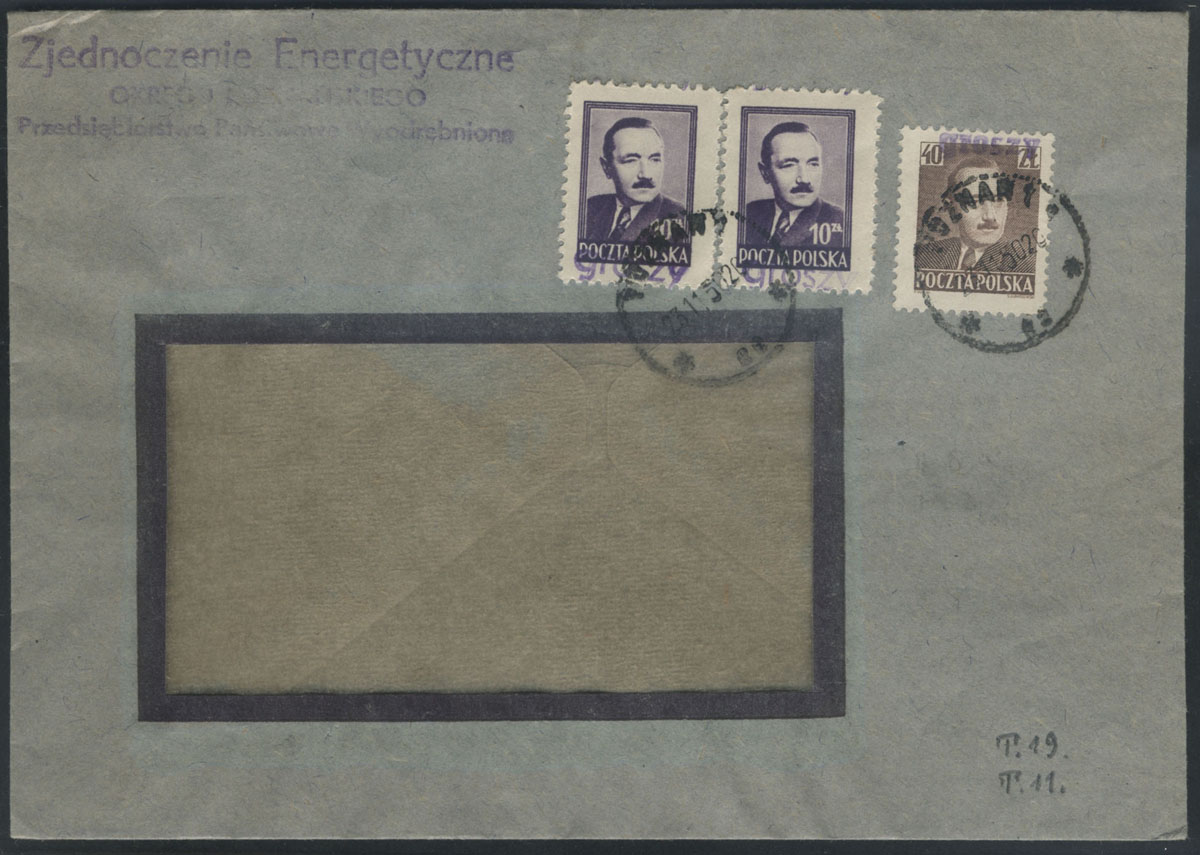 1950 groszy, list firmowy z Hrubieszowa do Warszawy opłacony znaczkami z nadrukiem groszy typ 4 w barwie fioletowej i czarnej. | Fi.472, 474, 523 Mi.623, 625, 655 |