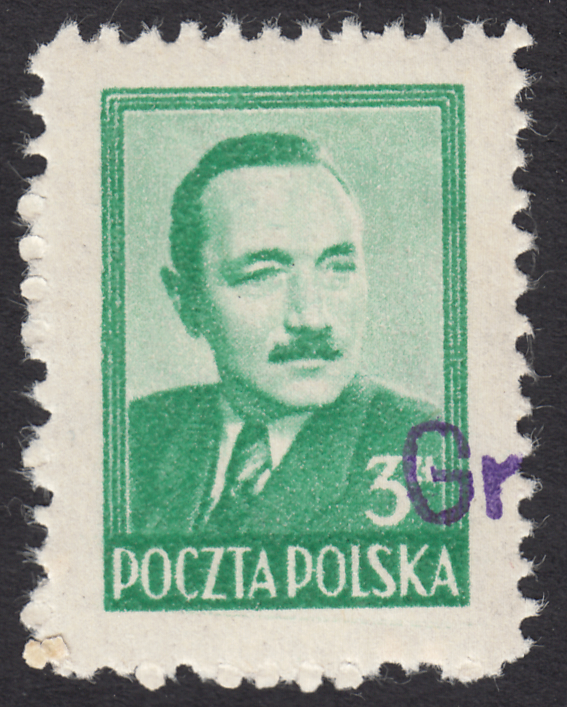 1950 "groszy - lokalny", Tomaszów, Bierut, nienotowany dotąd znaczek za 3 zł. z fioletowym stempelkiem rzadkiego typu 47, gwarancja Krawczyk. | Fi.471 Mi.622 |