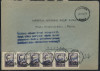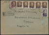 1950 groszy, list polecony z Piły do Warszawy opłacony znaczkami z nadrukiem groszy typ 16 w barwie fioletowej. | Fi.474, 513, 522, 525, 527 Mi.625, 654, 657, 659, 665 |
