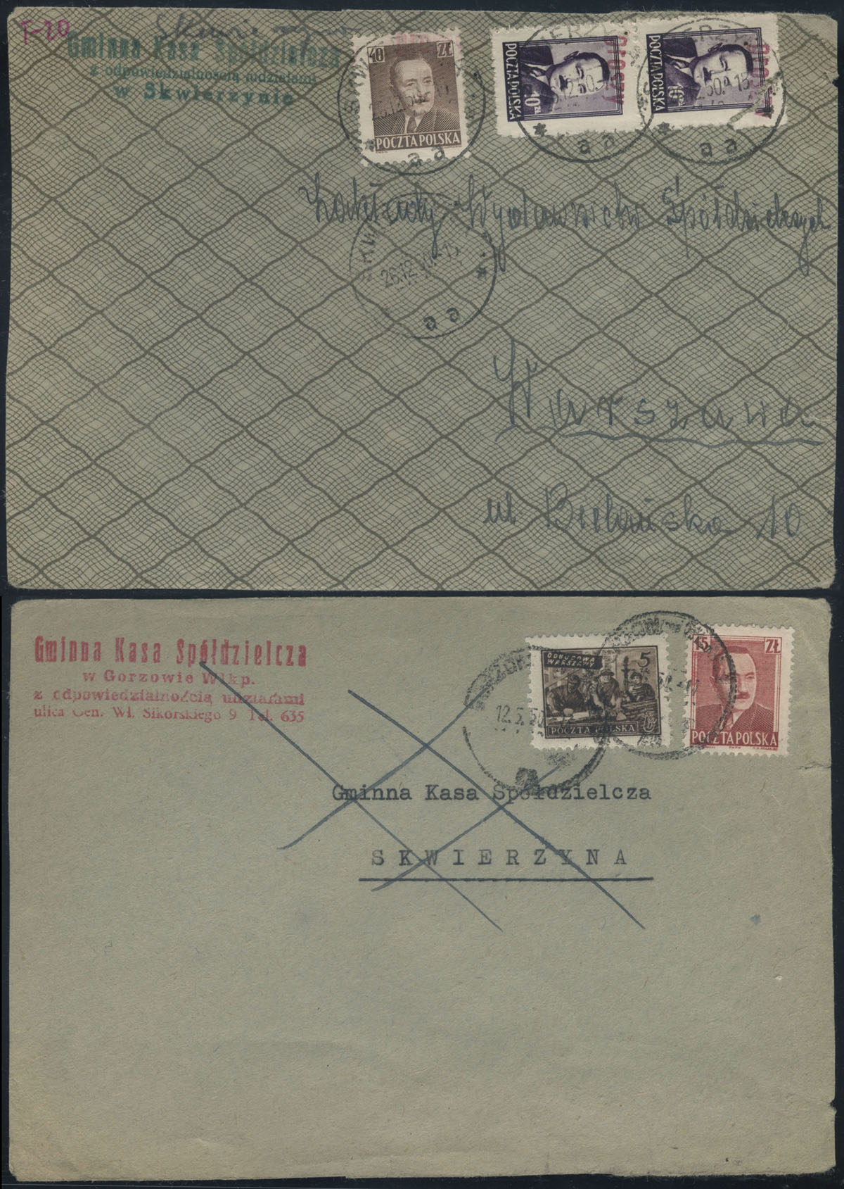 1950 groszy, front listu z Skwierzyna do Warszawy opłacony znaczkami z nadrukami groszy typ 20 w barwie czerwonej, na odwrocie wcześniej użyta koperta listu z Gorzowa Wielkopolskiego do Skwierzyny. | Fi.474, 525 |