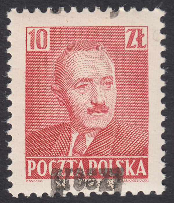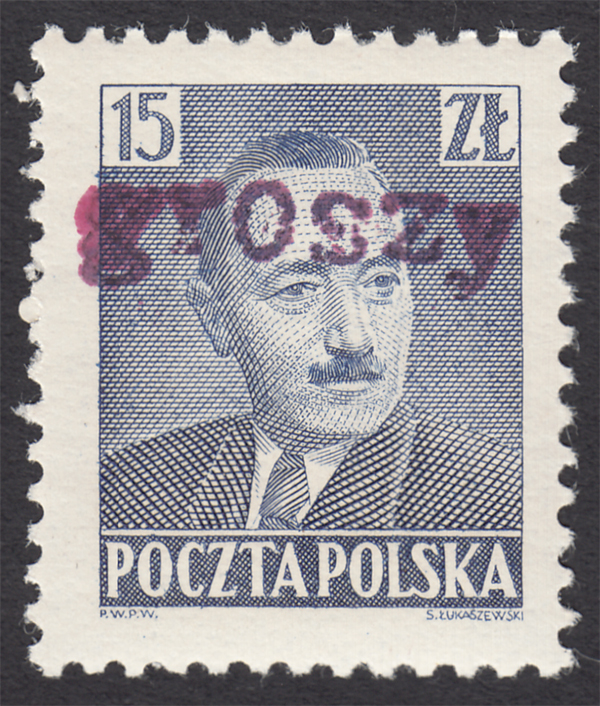 1950 "groszy - lokalny", Ozimek, Bierut, znaczek za 40 zł. z rzadszym w kolorze czerwonym stempelkiem typu 42. | Fi.525 Mi.657 |