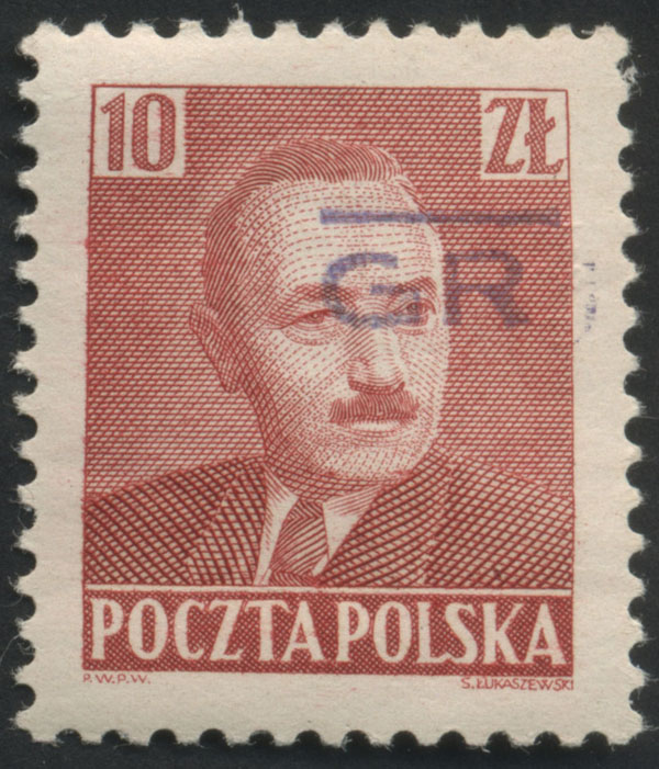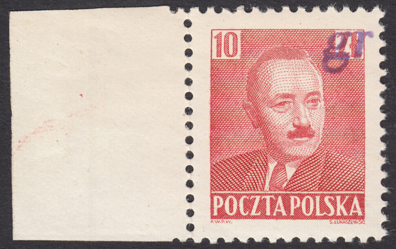 1950 "groszy - lokalny", Piła, Bierut, marginesowy znaczek za 10 zł. z fioletowym stempelkiem typu 41, pochodzi z historycznej kolekcji S.Ćwiertni i ma na odwrocie znaczka jego gwarancję. | Fi.520 Mi.651 |