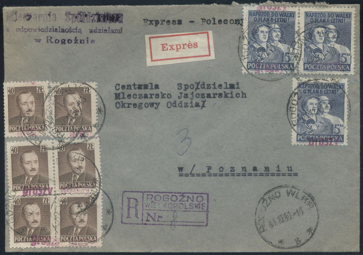 1950 groszy, ekspresowy list polecony z Rogoźna Wielkopolskiego do Poznania opłacony znaczkami z nadrukiem groszy typ 20 w barwie fioletowej/liliowej. | Fi.525, 527 |