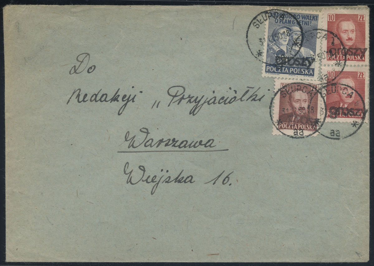 1950 groszy, list z Słupcy do Warszawy opłacony znaczkami z nadrukiem groszy typ 16 w barwie czarnej. | Fi.520, 524, 527 |