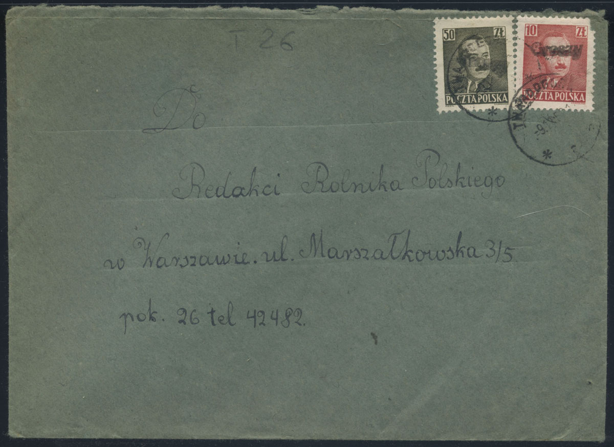 1950 groszy, list z Twardogóry nadany 9.11.50 do Warszawy opłacony znaczkami z nadrukami groszy typ 26 w barwie czarnej. | Fi.520, 524 |