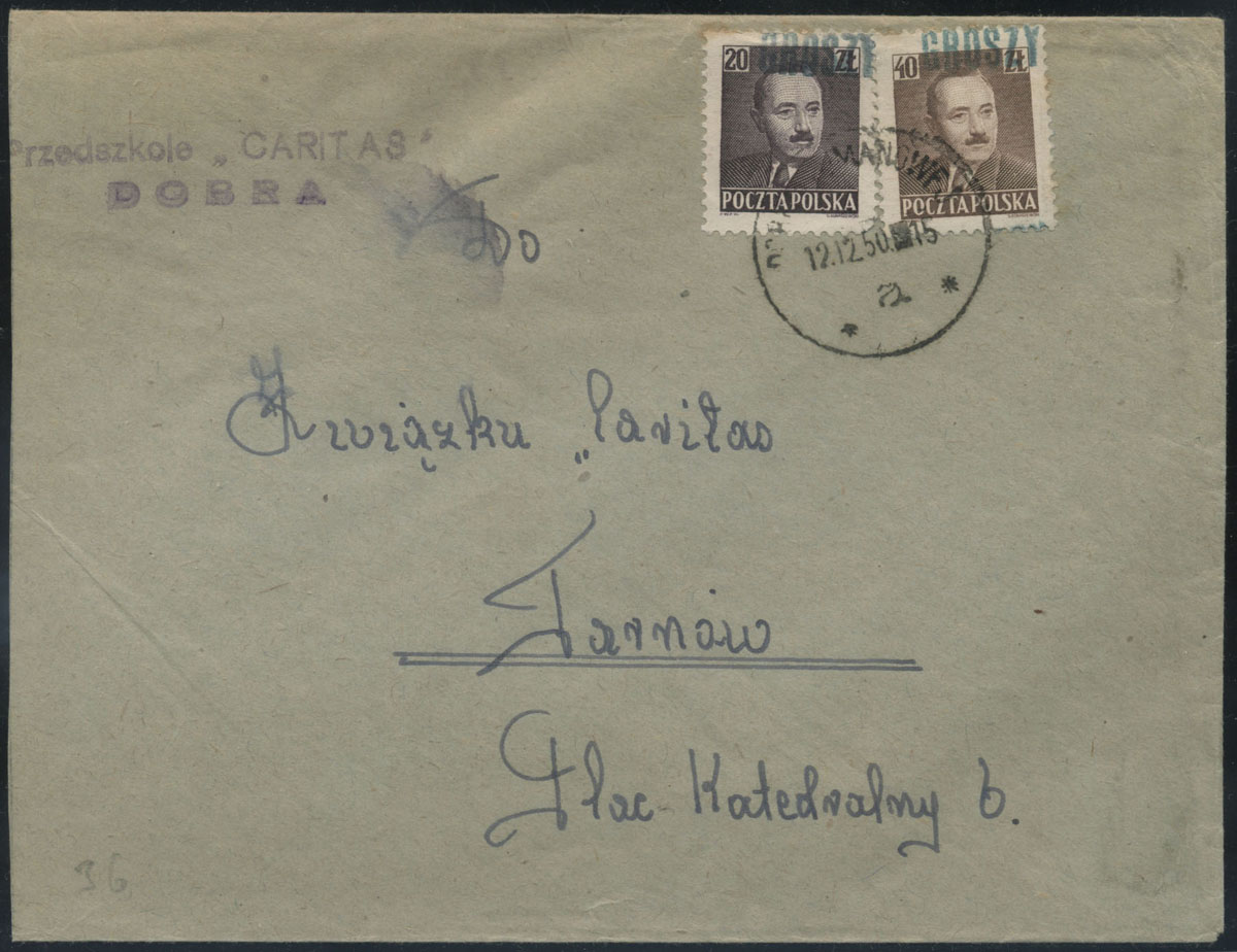 1950 groszy, list z Brwinowa do Warszawy opłacony znaczkami z nadrukiem groszy typ 23 w barwie czarnej. | Fi.522, 525 Mi.654, 657 |