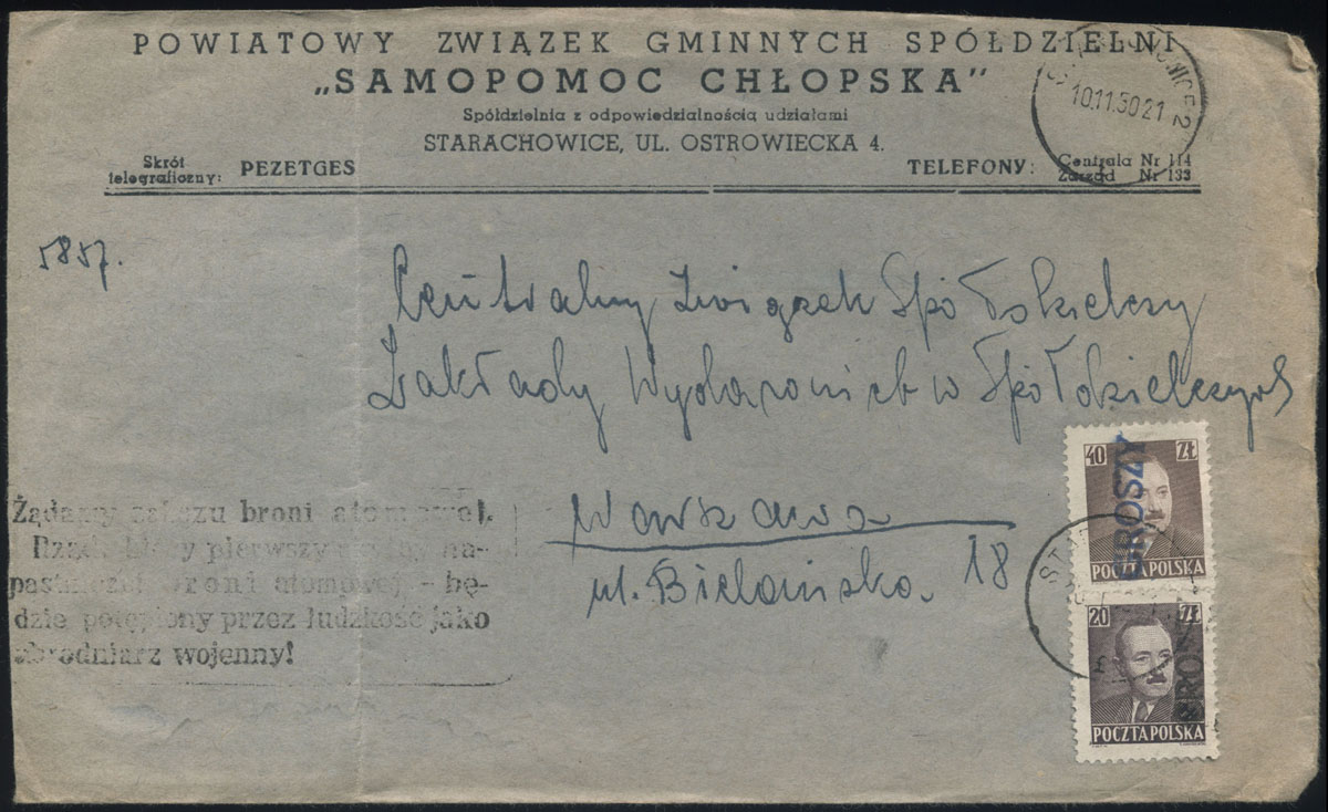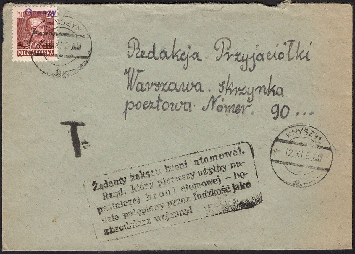 1950 groszy, list z Knyszyna do Warszawy opłacony znaczkiem z nadrukiem groszy typ 26 w barwie fioletowej z ładnie odbitym tekstowym stemplem propagandowym o zakazie broni atomowej + stempelek doplaty "T". | Fi.524 |