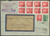 1950 "groszy - lokalny", Bielsko 2, znaczki za 40 zł Bierut (staloryt) z wyraźnymi fioletowymi nadrukami typu 28 - frankatura mieszana ze znaczkami bez nadruku, ekspresowy list polecony wysłany 24.1.1951 do Warszawy, znaczki skasowane jednoobrączkowym datownikiem BIELSKO 1 z wyróżnikiem "i", na odwrocie datowniki odbiorcze z 25.1; całości ofrankowane znaczkami z nadrukami lokalnymi, nawet te najpopularniejsze, należą do bardzo rzadkich; bardzo dobry stan zachowania; sygnowano Czesław Malingiewicz. | Fi.525, 519, 520 Mi.657, 547, 548 |