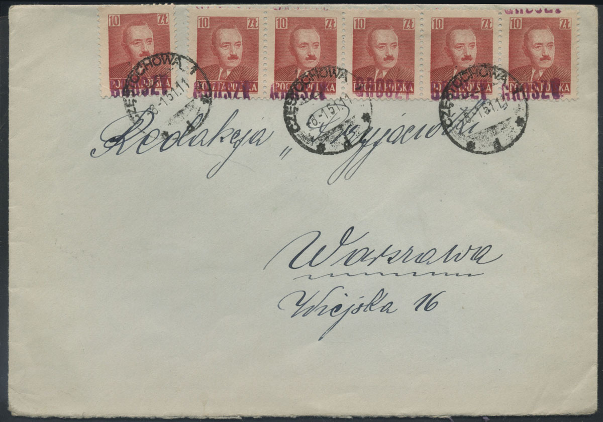 1951 groszy, list z Częstochowy do Warszawy opłacony znaczkami z nadrukiem groszy typ 3 w barwie czerwonobrązowej. | Fi.520 |