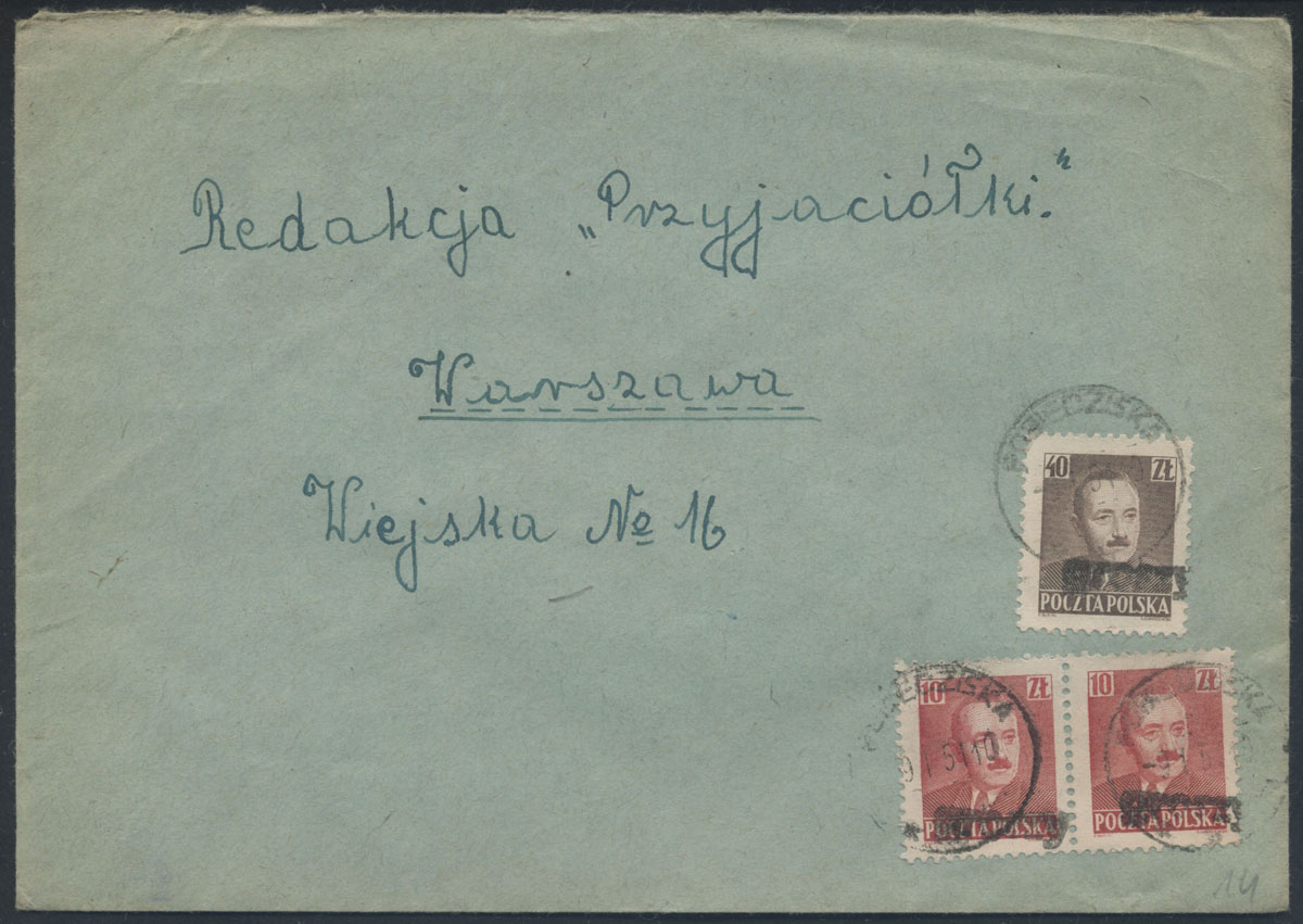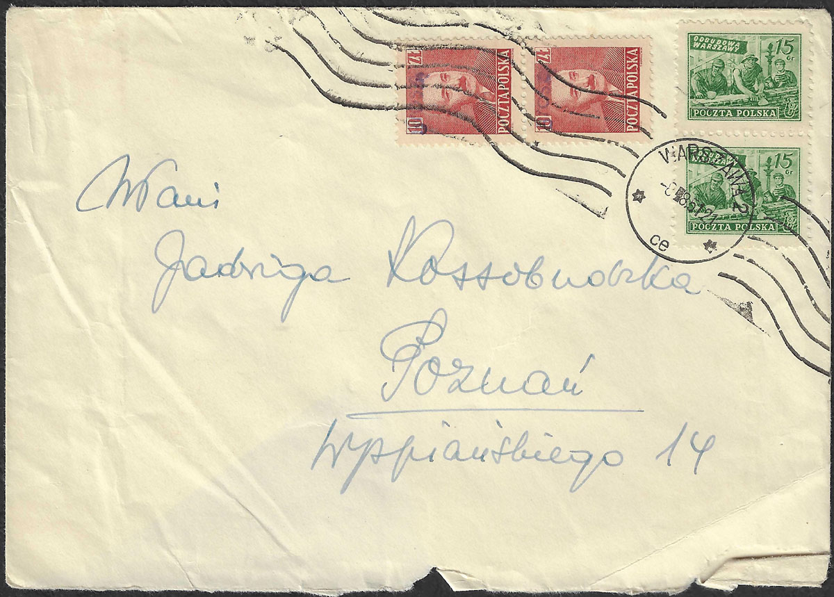 1951 groszy, list z Warszawy do Poznania opłacony znaczkami z nadrukiem groszy typ 1 w barwie fioletowej. | Fi.520, 541 |