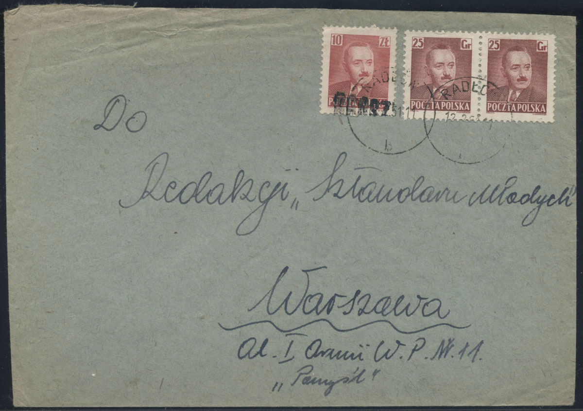 1951 groszy, list z Żychlina do Warszawy opłacony znaczkami z nadrukiem groszy typ 5 w barwie fioletowej. | Fi.522, 525 Mi.654, 657 |