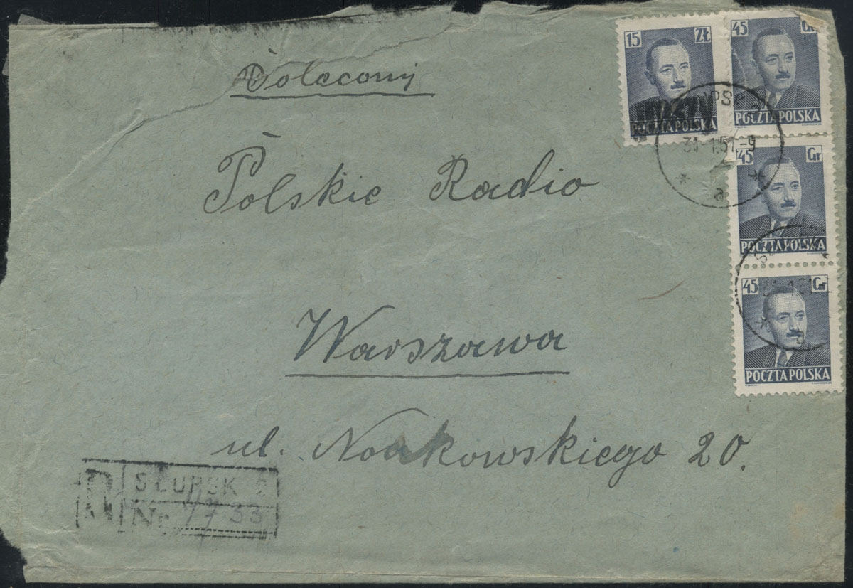 1951 groszy, list polecony z Słupska 2 do Warszawy opłacony znaczkami z nadrukiem groszy typ 21 w barwie czarnej. | Fi.521, 539 |
