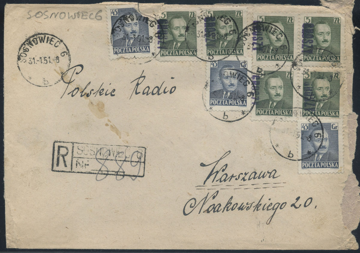 1951 groszy, list polecony z Sosnowca 6 do Warszawy opłacony znaczkami z nadrukiem groszy typ 3 w barwie fioletowej. | Fi.519, 539 |