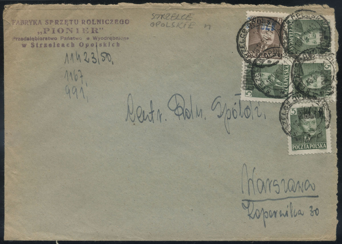 1951 groszy, list z Strzelec Opolskich do Warszawy opłacony znaczkami z nadrukiem groszy typ 3 w barwie niebieskiej i czarnej. | Fi.519, 525 |