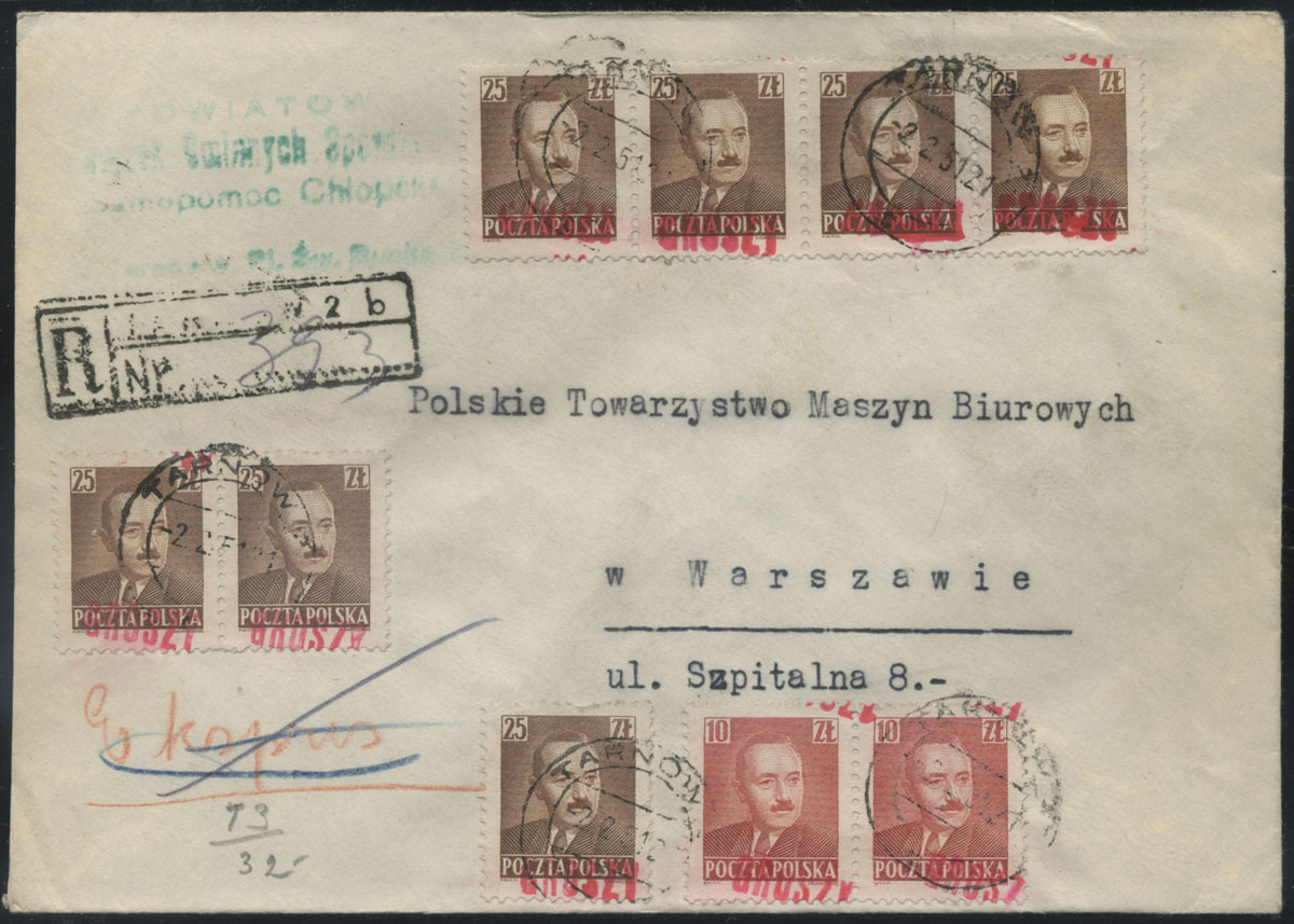 1951 groszy, list polecony z Objazdu do Warszawy opłacony znaczkami z nadrukiem groszy typ 21 w barwie czerwonej. | Fi.519, 540, 542 Mi.650, 678, 680 |