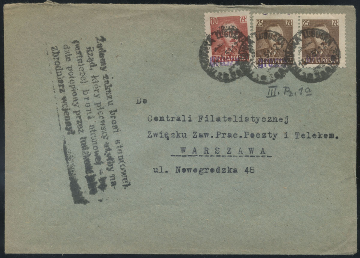 1951 groszy, list z Bytomia 2 do Warszawy opłacony znaczkami z nadrukiem groszy typ 3 w barwie fioletowej. | Fi.520 Mi.651 |