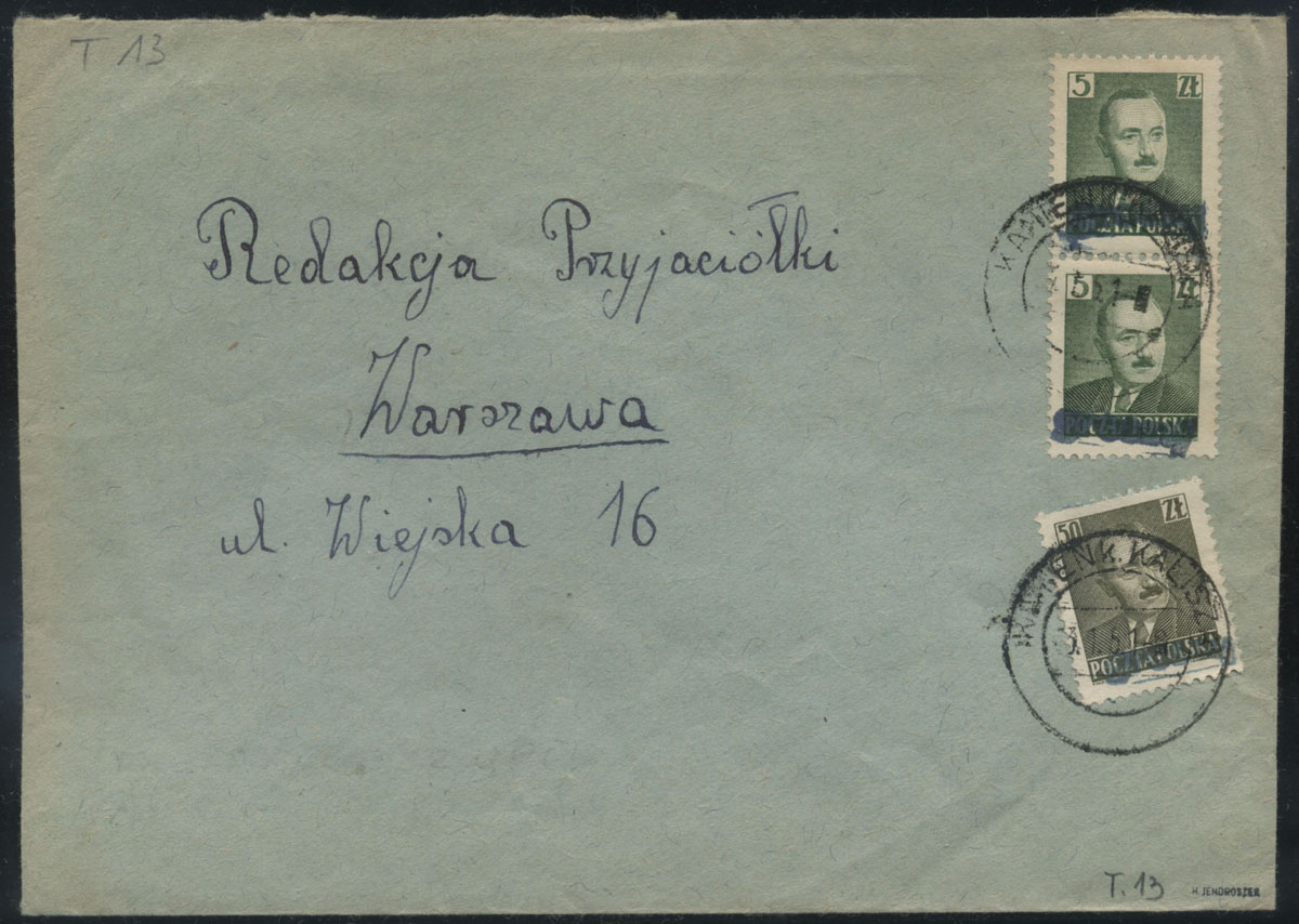 1951 groszy, list z Kamienia koło Kalisza do Warszawy opłacony znaczkami z nadrukami groszy typ 13 w barwie niebieskozielonej, gwarancja Jendroszek. | Fi.519, 526 |
