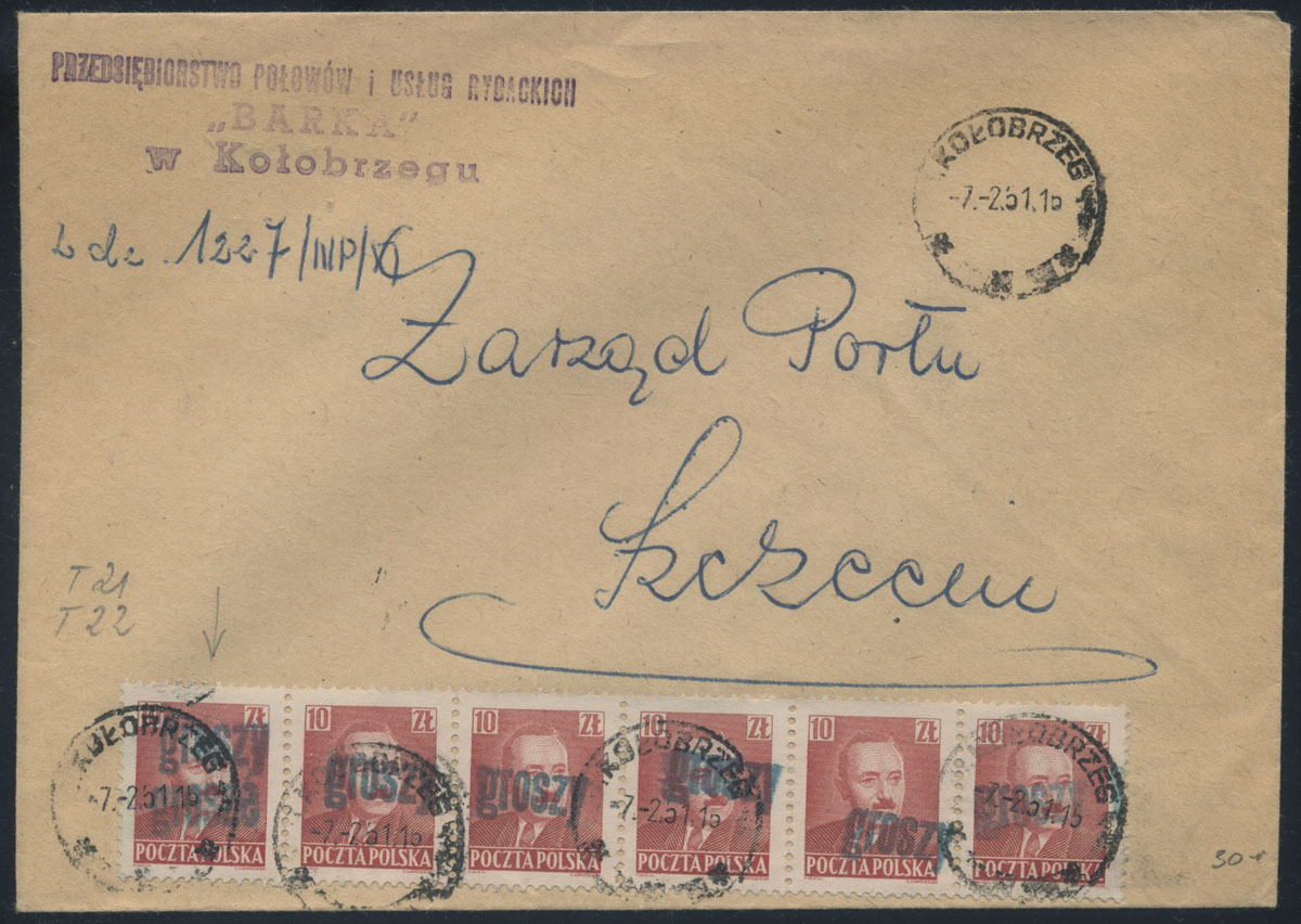 1951 groszy, list z Kołobrzegu do Szczecina opłacony znaczkami z nadrukami groszy typ 21 w barwie niebieskiej, jeden znaczek z nadrukiem podwójnym dwoma typami nadruku 21 i 22. | Fi.520 |