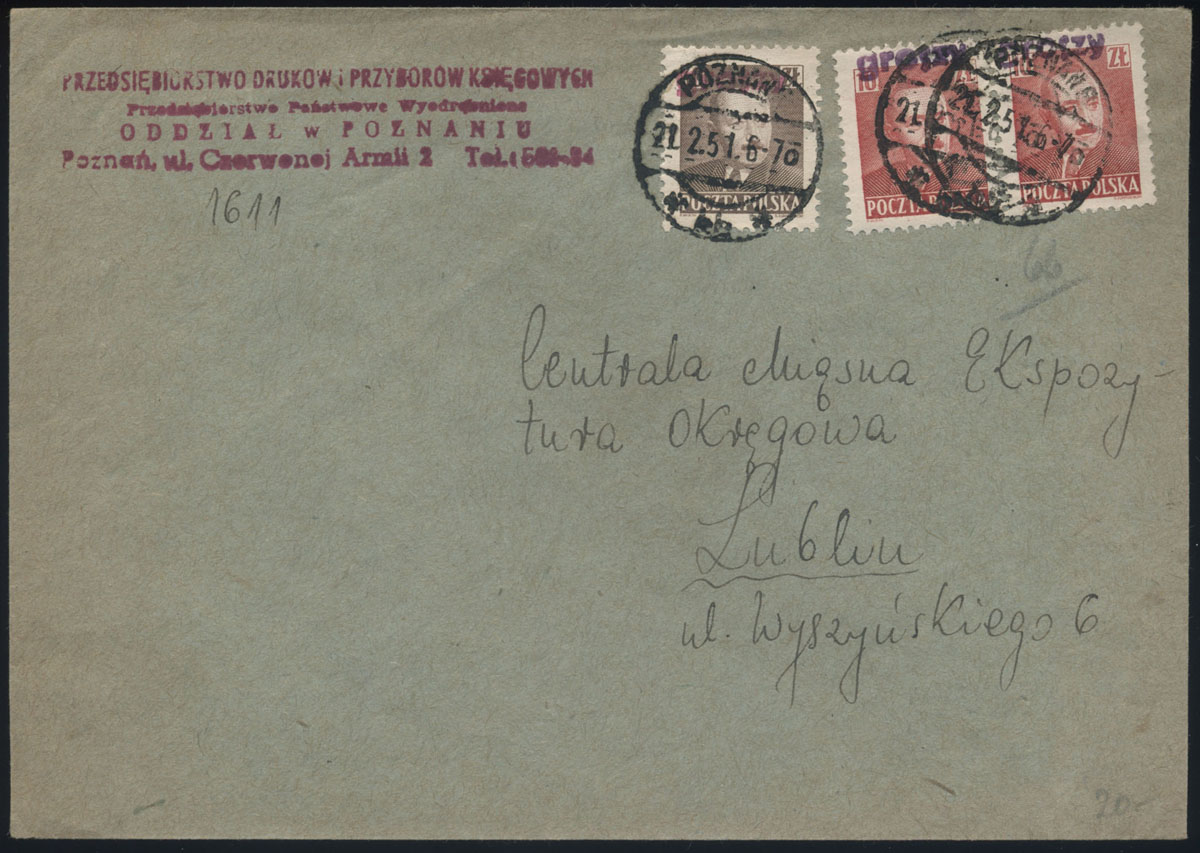 1951 groszy, list z Poznania do Dąbrowy Górniczej opłacony znaczkami z groszy nadrukiem typ 10 w barwie fioletowej. | Fi.519, 542 Mi.650, 680 |