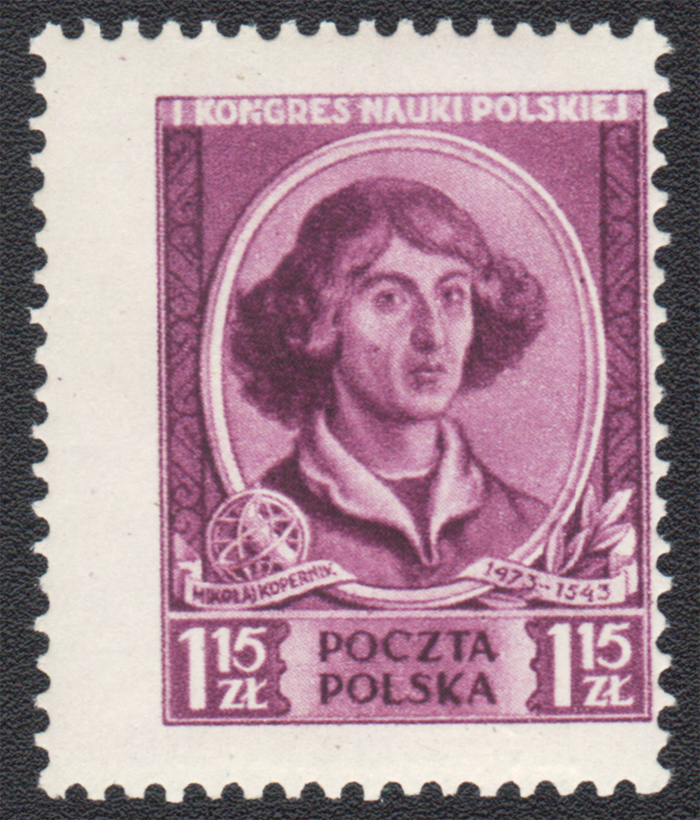 1951 kongres nauki polskiej - Mikołaj Kopernik, makulaturowy znaczek za 1,15 zł ze znacznie przesuniętym rysunkiem, bardzo dobry stan zachowania; gwarancja i oznaczenie MK Walocha. | Fi.560 MK Mi.698 |