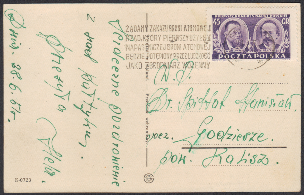 1951 I Kongres Nauki Polskiej - Z.Wróblewski i K.Olszewski, 45 gr znaczek najdroższy w serii - frankatura pojedyncza, prawidłowo opłacona widokówka wysłana 28.6 z urzędu Gdynia 2 do miejscowości Godziesze, znaczek skasowany doskonałej jakości odbitką stempla propagandowego "ŻĄDAMY ZAKAZU BRONI ATOMOWEJ RZĄD, KTÓRY PIERWSZY UŻYŁBY NAPASTNICZEJ BRONI ATOMOWEJ BĘDZIE POTĘPIONY PRZEZ LUDZKOŚĆ JAKO ZBRODNIARZ WOJENNY"; bardzo rzadki walor w doskonałym stanie zachowania (Myślicki 50 112). | Fi.558 Mi.696 |