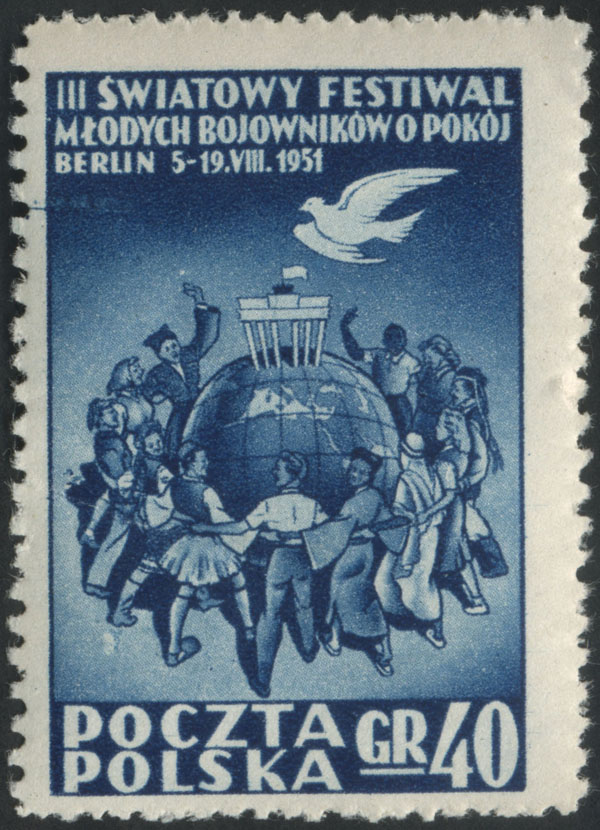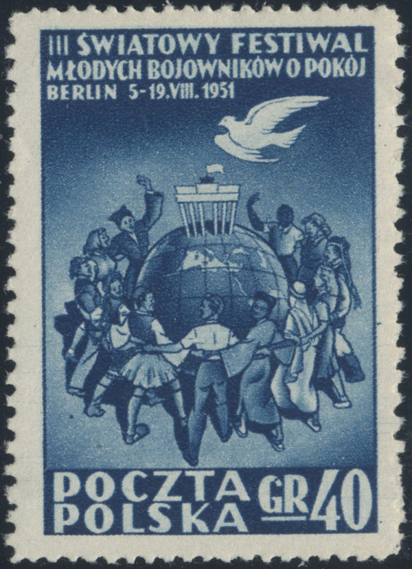 1951 III Światowy Festiwal Młodych Bojowników o Pokój w Berlinie, znaczek z usterką "plama pod gołąbkiem". | Fi.566 Mi.701 |