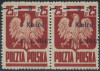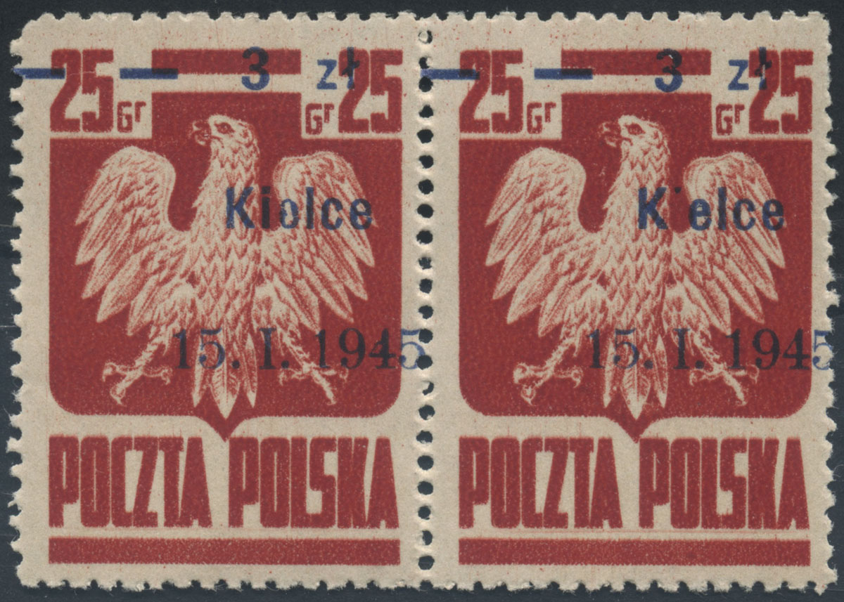 1945 "Kielce" - wyzwolenie dziesięciu miast, parka makulatury znaczków za 3 zł./25 gr. z przesuniętym w poziomie nadrukiem, lewy znaczek z błędem na poz.9/59 "brak i w K elce", a prawy na poz.10/60 "rozbicie prawej strony przesuniętego nadruku", gwarancja i opis błędu Schmutz. | Fi.353MK B8 Mi.390V |