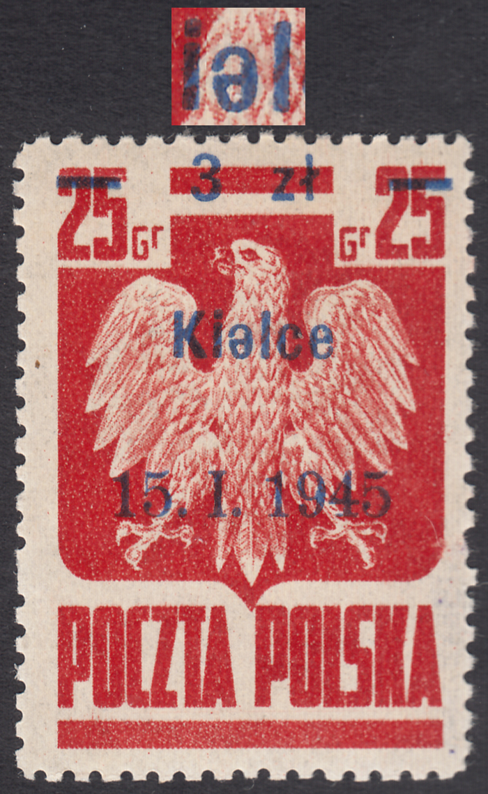 1945 wyzwolenie miast, znaczek z nadrukiem z poz. 11 z błędem "pierwsza litera e w Kielce odwrócona", gwarancja i oznaczenie Wysocki. | Fi.353B9 Mi.390V |