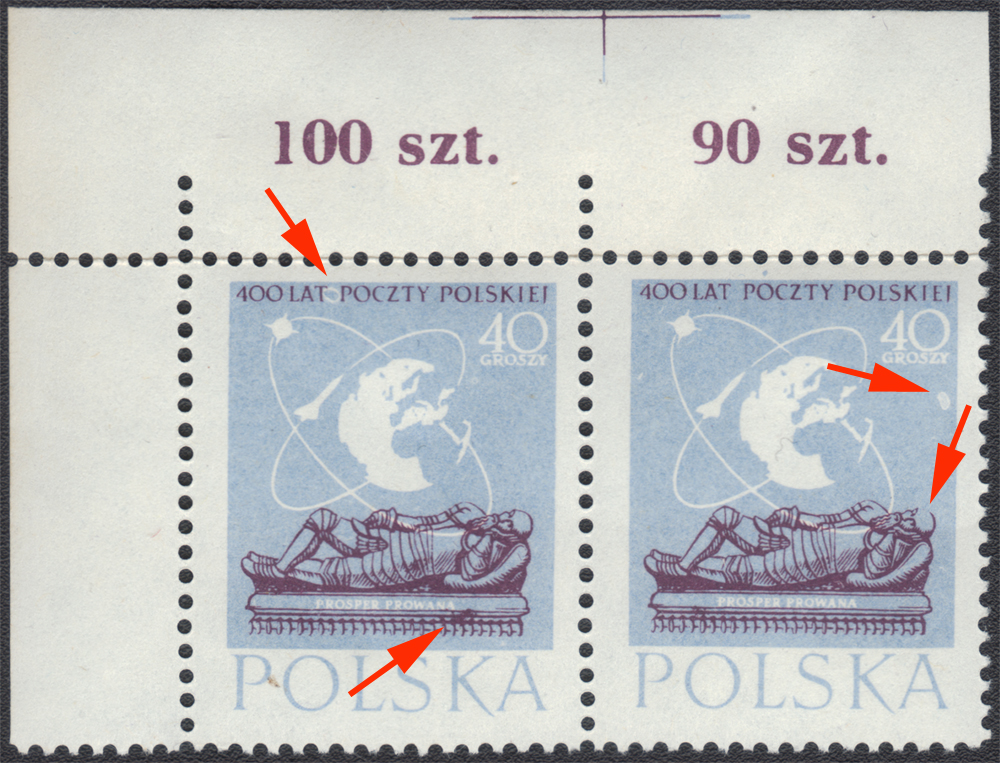 1958 400-lecie Poczty Polskiej, 40 gr - narożna parka pozioma, lewy znaczek z błędem na poz.1 "plama między T i P", prawy z błędem na poz.2 "biała plama pod GROSZY"; bardzo dobry stan zachowania; gwarancja. | Fi.918 B Mi.1063 |