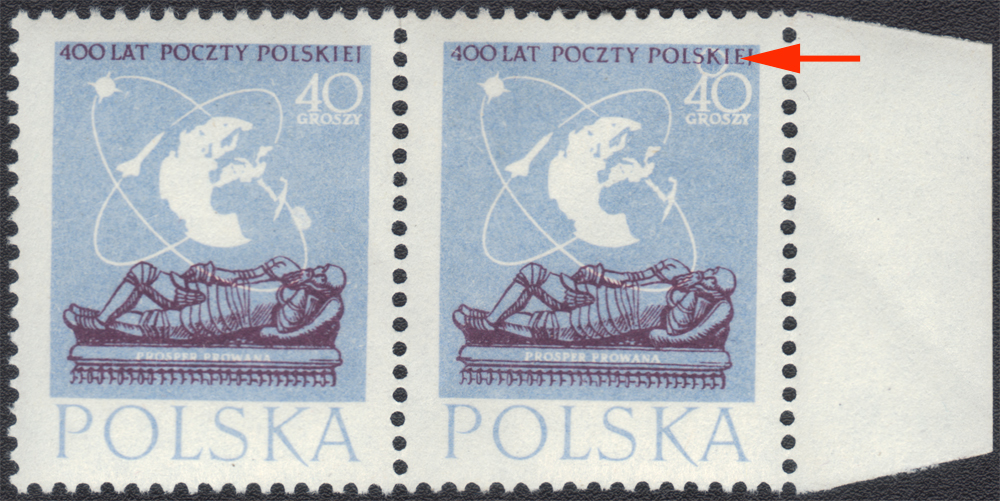 1958 400 lat Poczty Polskiej, znaczek z przesuniętą perforacją wchodzącą na dolną część obrazu znaczka - napisy częściowo już w linii górnego ząbkowania. | Fi.927MK Mi.1072 |