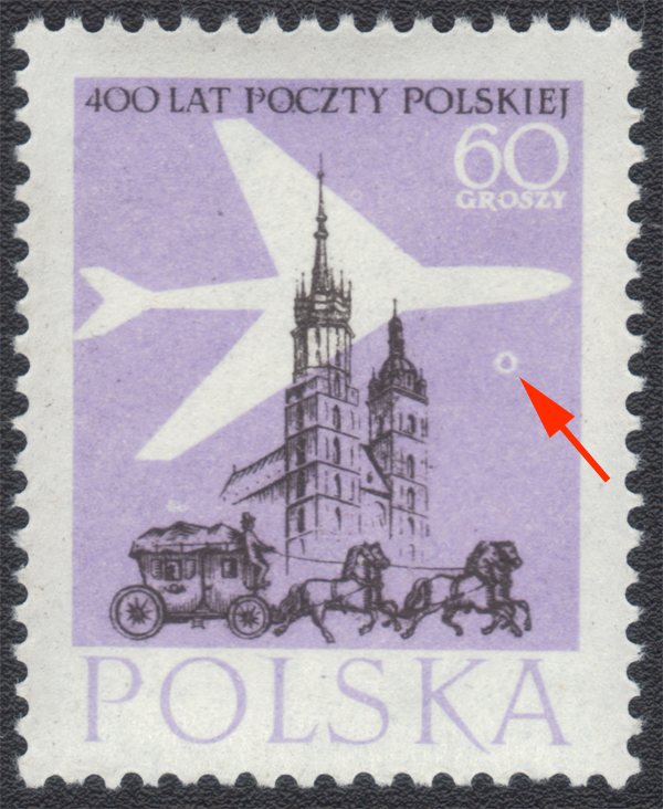 1958 400-lecie Poczty Polskiej, 60 gr - znaczek z błędem "plama pod przednią częścią kadłuba samolotu"; bardzo dobry stan zachowania; gwarancja. | Fi.919 B Mi.1064 |