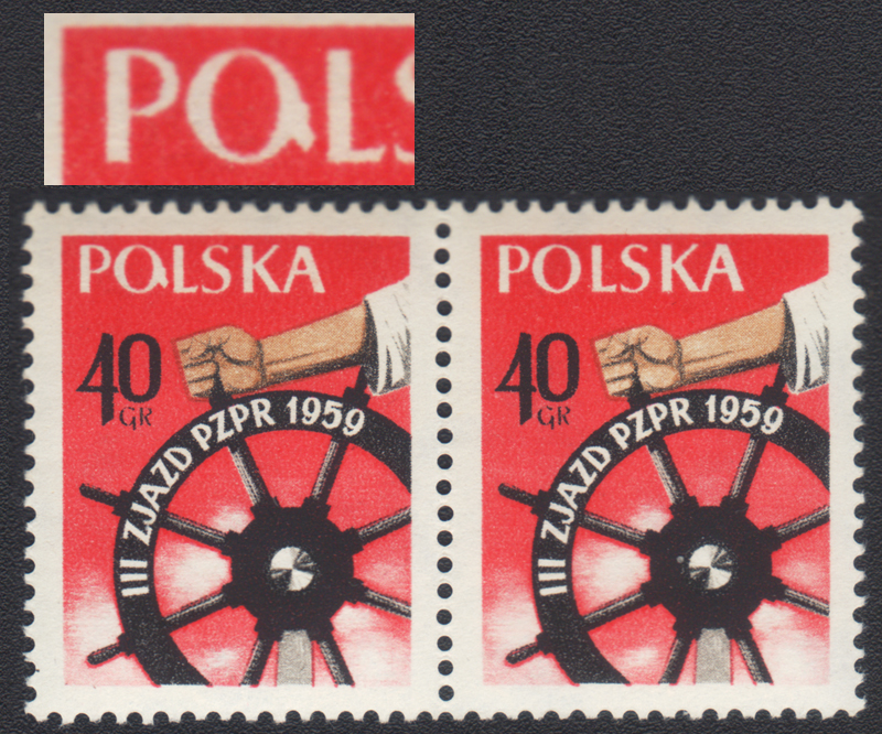 1959 III Zjazd PZPR, znaczek z błędem "biała plama przy O w POLSKA". | Fi.945B1 Mi.1090 |