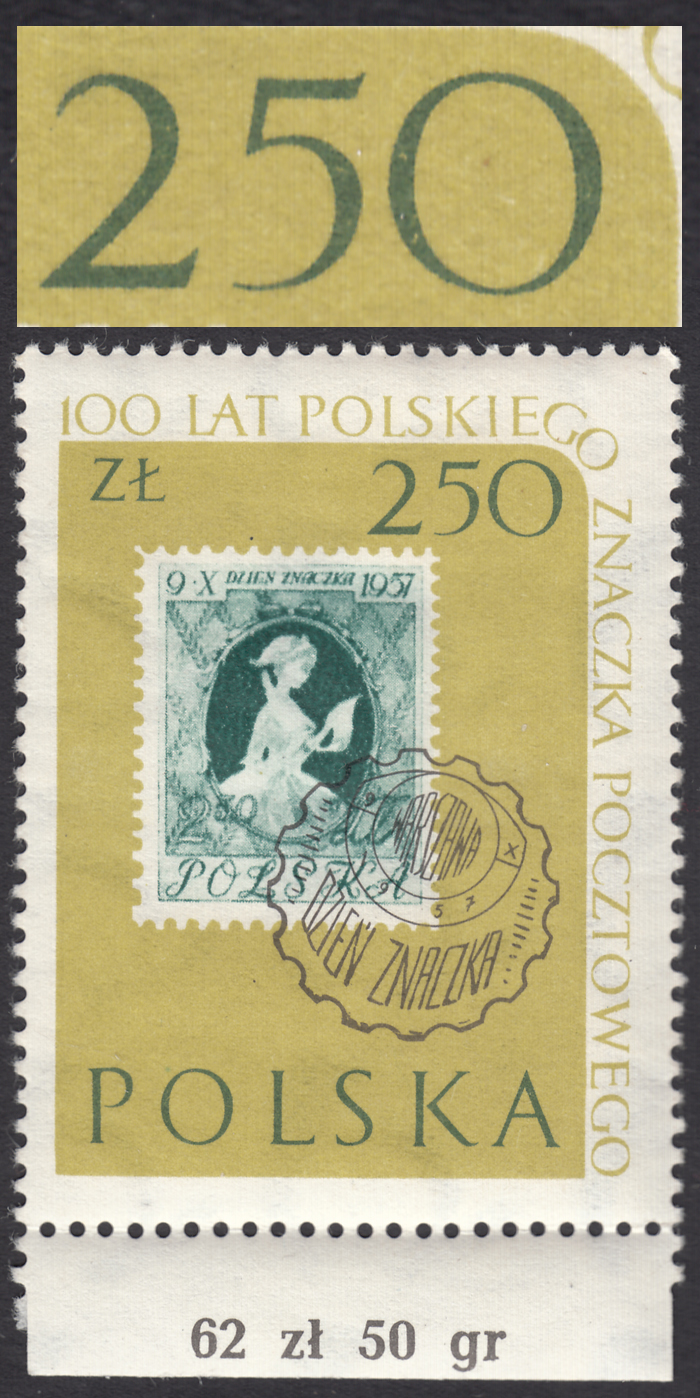 1960 100-lecie polskiego znaczka pocztowego, znaczek z klasycznym błędem "250 zamiast 2,50" z rzadszej poz.37 (Mi.75 euro), liczby rozrachunkowe na marginesie umożliwiają łatwe zidentyfikowanie pozycji w arkuszu, to piąty znaczek z ostatniego 8 znaczkowego rzędu 4x8+5=37, nie musi mieć gwarancji. | Fi.1011 B1 Mi.1155I |
