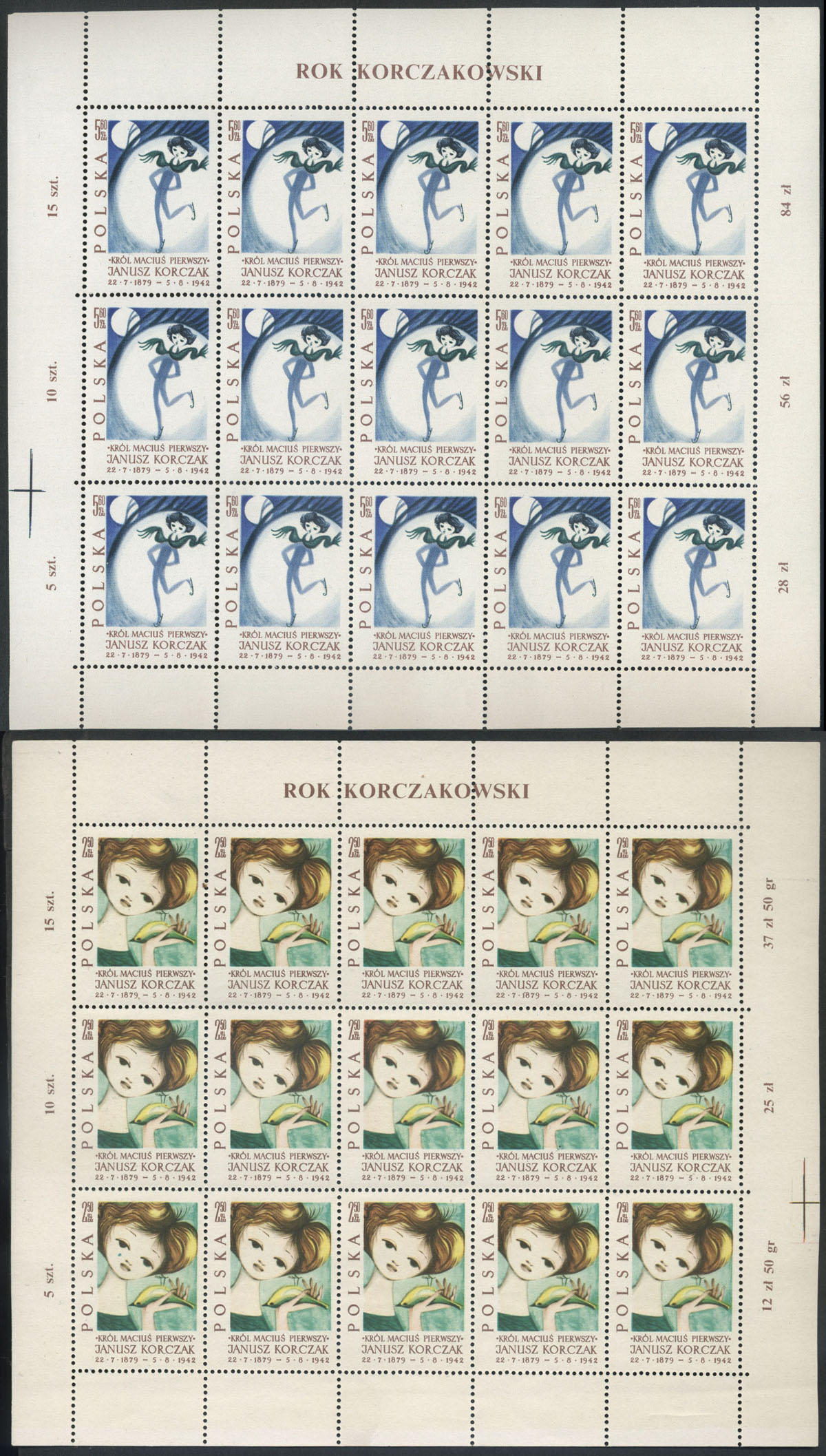1962 Rok Korczakowski, seria w arkuszach sprzedażnych w dobrym stanie, narożny lewy dolny znaczek za 2,50 zł z usterką "plama na twarzy dziewczynki". | Fi.1209-14 ark. Mi.1357-62 |