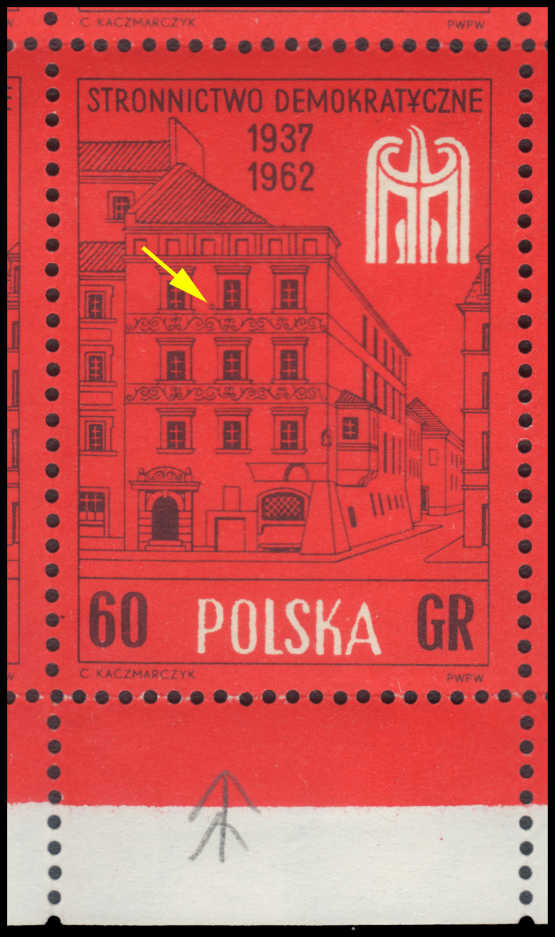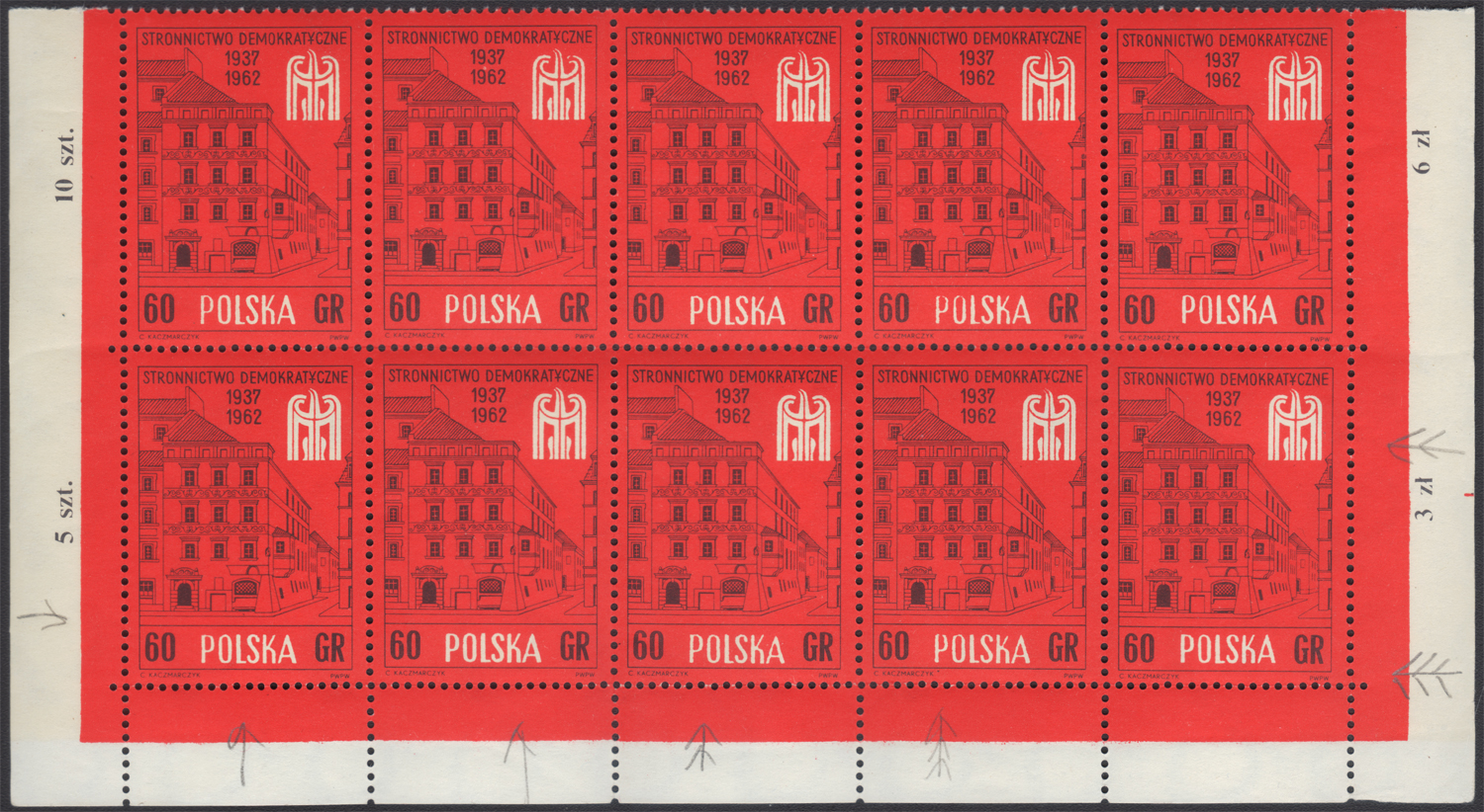 1962 25-lecie Stronnictwa Demokratycznego, 10-blok znaczków, na poz.28 w sektorze 2 z klasycznym błędem "doniczka na parapecie", papier ze znakiem wodnym - III.2; bardzo dobry stan zachowania; gwarancja. | Fi.1207 B1 Mi.1355 |