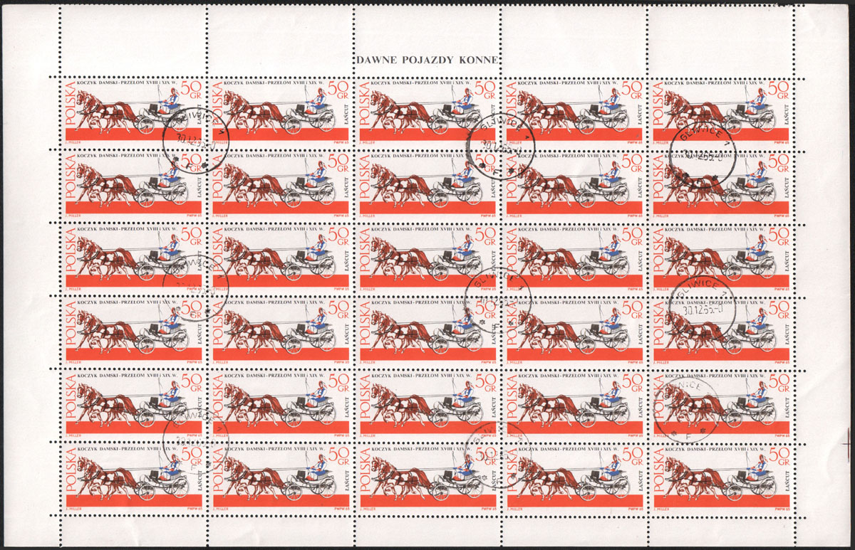 1965 dawne pojazdy konne, stemplowany arkusz znaczka za 50 gr., pustopola na górnym marginesie. | Fi.1497 ark. Mi.1646 |