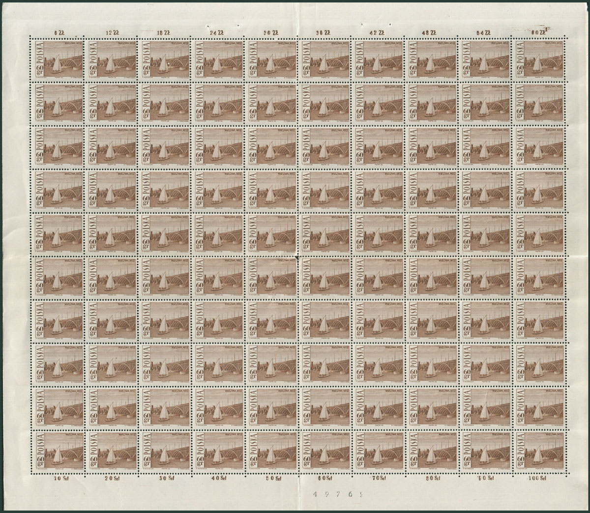 1966 dożynki, arkusz sprzedażny znaczka za 3,40 zł, arkusz zagięty w połowie, rozdarcie na lewym marginesie i częściowo na 16. znaczku. | Fi.1547 ark. Mi.1695 |