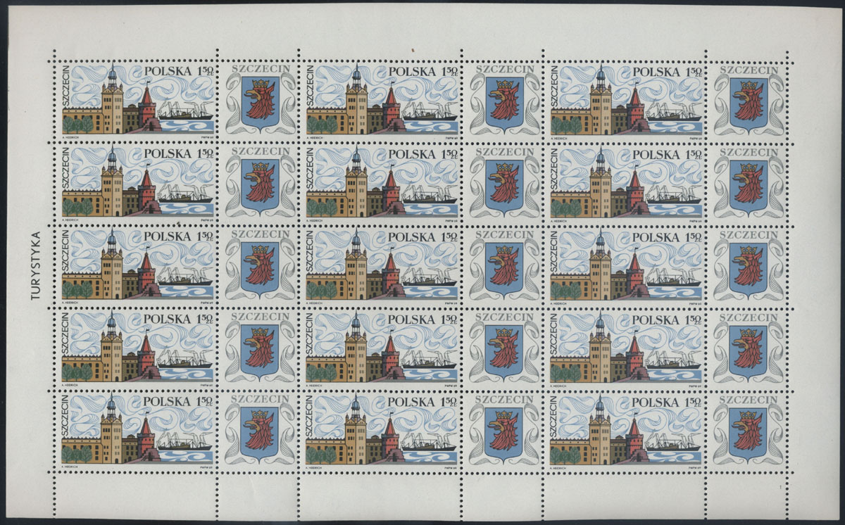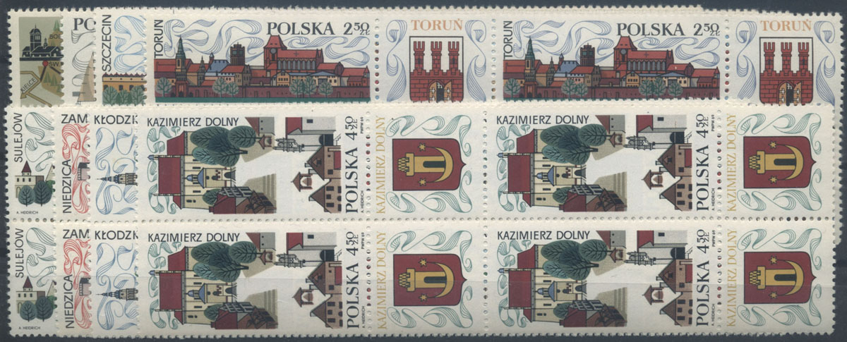 1969 współcześni pisarze polscy, górna część arkusza ze znaczkami rozdzielonymi długimi przywieszkami, z dodatkowymi dwoma rzędami znaczków, na trzech wartościach (60gr, 1,35zł, 3,40zł) na lewym marginesie oznaczenia walców; kasowane z pełną gumą, rzadko spotkane w takiej formie; bardzo dobry stan zachowania (Fi.350.-). | Fi.1832-38Pw Mi.1979-85Zf |