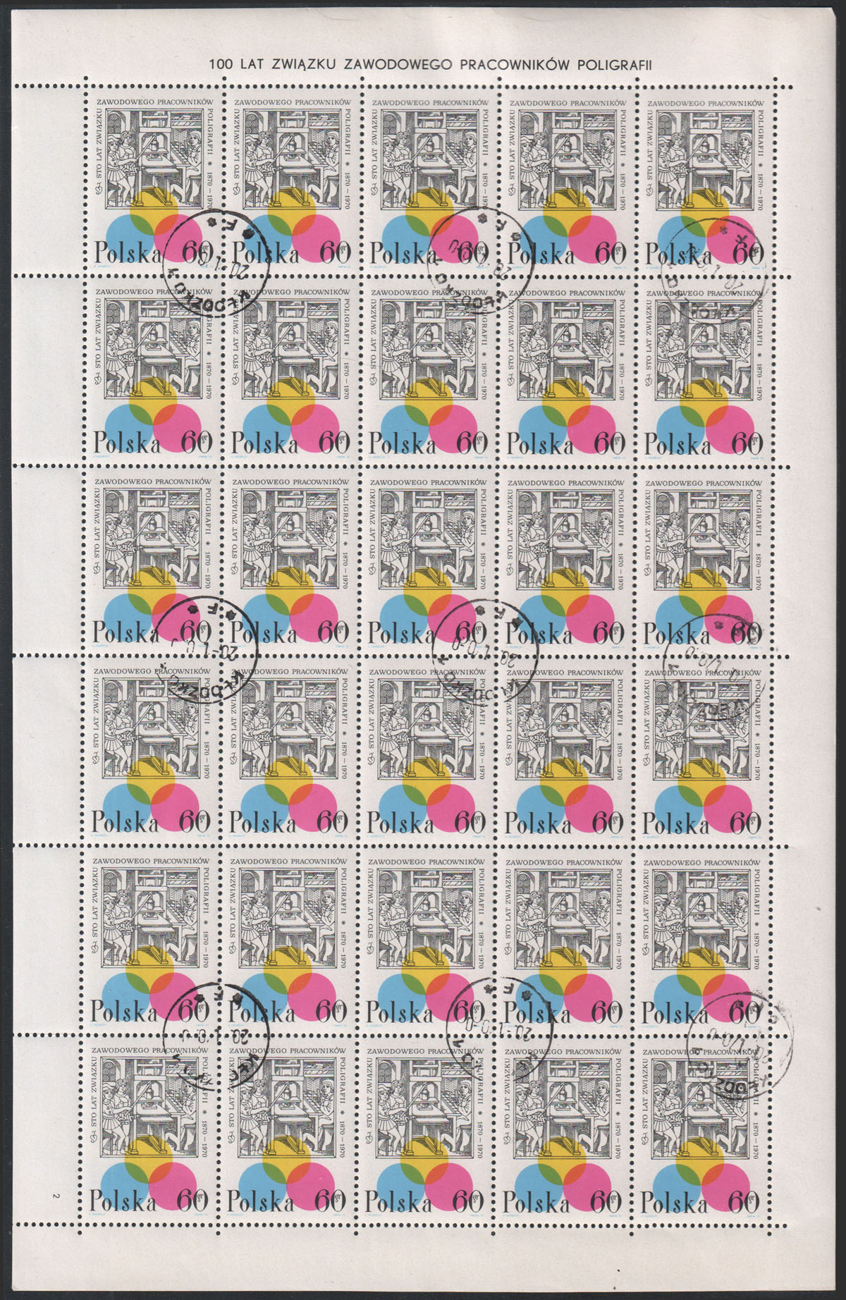 1970 100-lecie Związku Zawodowego Pracowników Poligrafii, stemplowany arkusz sprzedażny. | Fi.1840 ark. Mi.1987 |