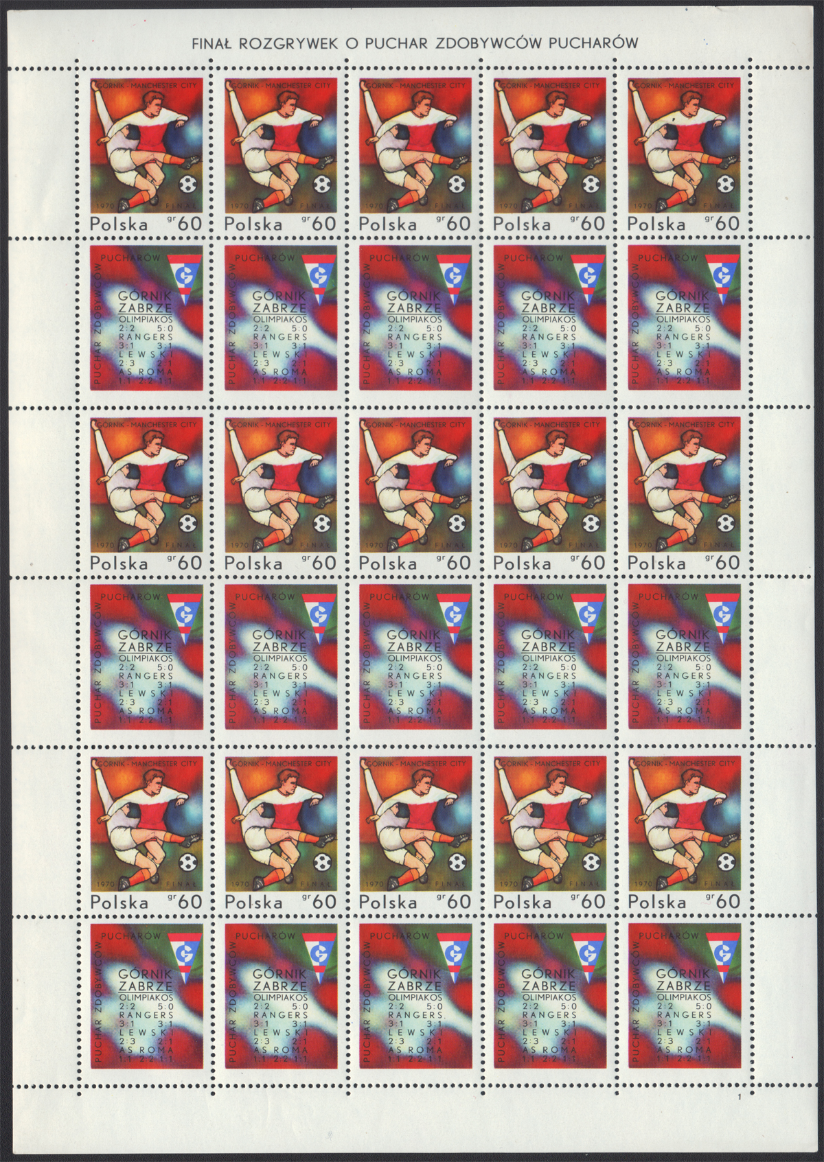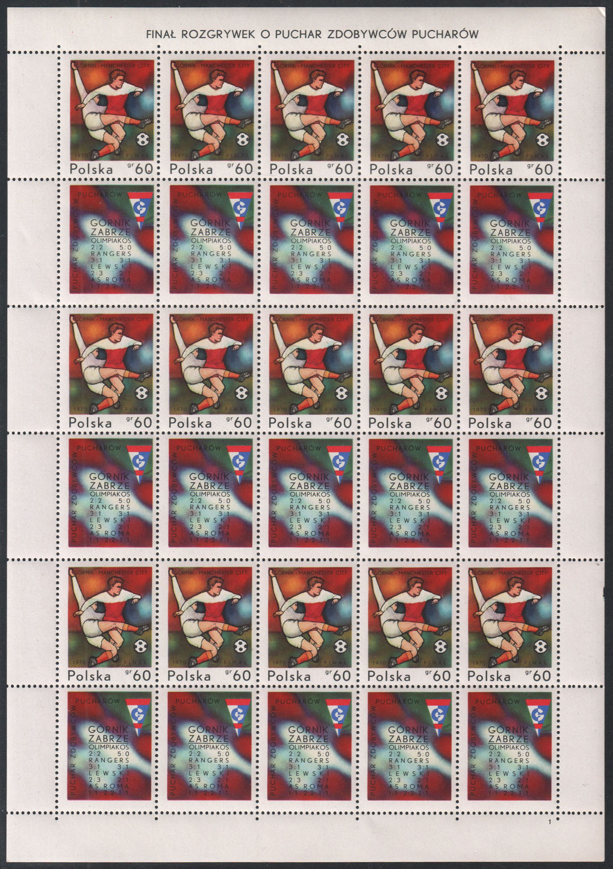 1970 finał rozgrywek o Puchar Zdobywców Pucharów w piłce nożnej, arkusz czysty (1 sektor); bardzo dobry stan zachowania. | Fi.1861 ark. Mi.2008 |