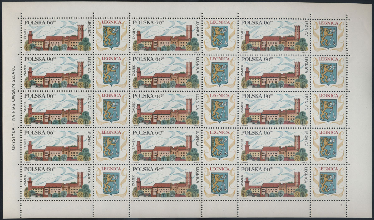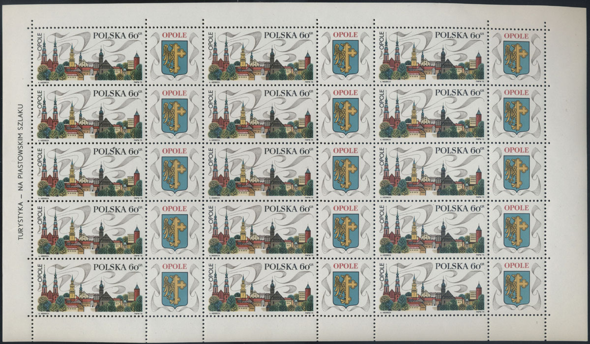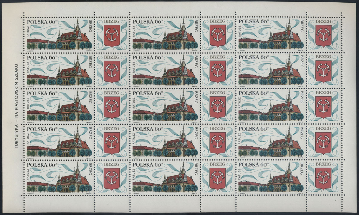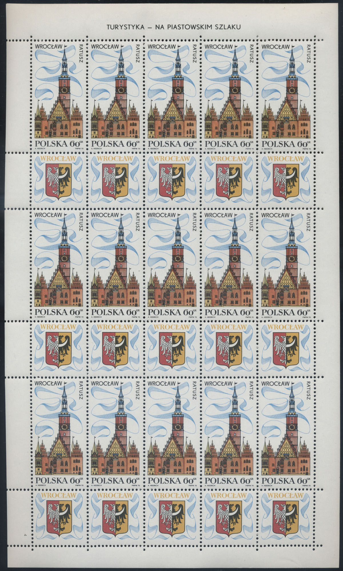 1970 turystyka - na piastowskim szlaku, czworoblok znaczków z przywieszkami, lewy górny z błędem na poz.7 w 1 sektorze "pęknięty budynek"; czyste, bardzo dobry stan zachowania; gwarancja i opis. | Fi.1853 B1 Mi.2002 |