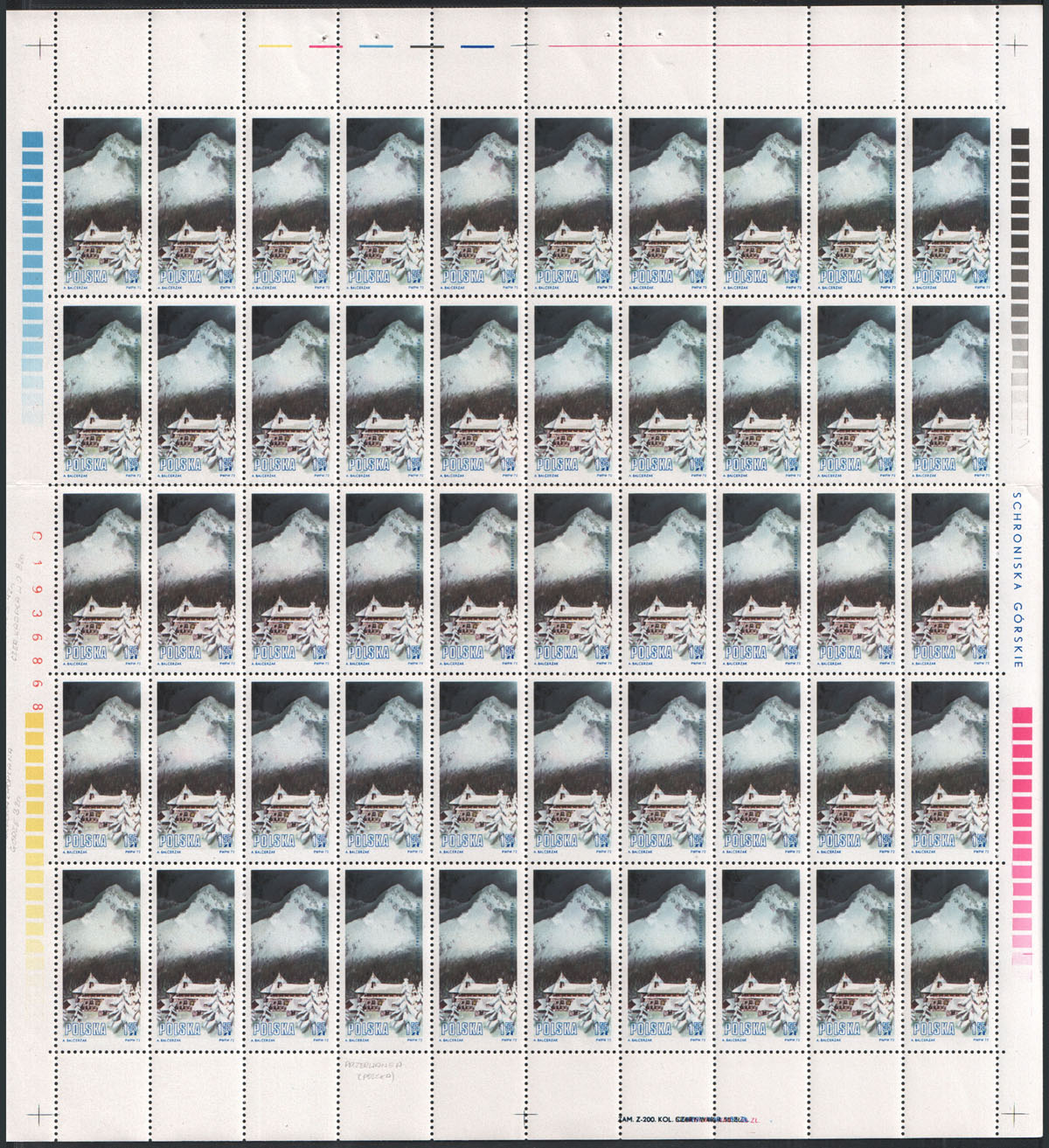1972 Turystyka - schroniska górskie, 1,55 zł arkusz sprzedażny, z błędami na: poz.37 "ślady na śniegu" w A w POLSKA", poz.38 "ślady na śniegu" pod SK w POLSKA", poz.49 "plamka na zaśnieżonym dachu" (pokazane w powiększeniu); czyste w bardzo dobrym stanie zachowania (arkusz złożony poziomo); znaczki z błędami gwarancja. | Fi.2059 B Mi.2206 |