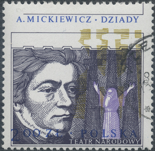 1978 arcydzieła dramaturgii polskiej, znaczek z silnie przesuniętą perforacją i drukiem barwy żółtej i niebieskiej, gwarancja. | Fi.2447MK Mi.2594 |
