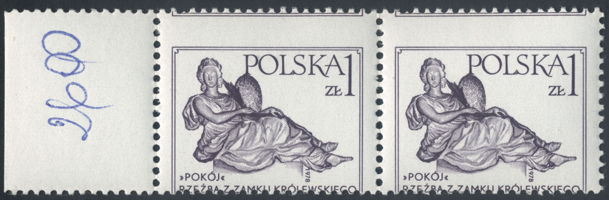 1978 rzeźba Pokój z Zamku Królewskiego w Warszawie, parka znaczków makulaturowych z perforacją przesuniętą w pionie. | Fi.2430MK Mi.2577 |