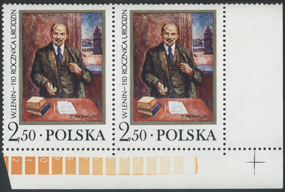 1980 110. rocznica urodzin Lenina, parka znaczków za 2,50 zł, prawy z błędem na poz.16 "krótszy przecinek"; bardzo dobry stan zachowania; gwarancja i opis Kalinowski. | Fi.2534 B3 Mi.2682 |