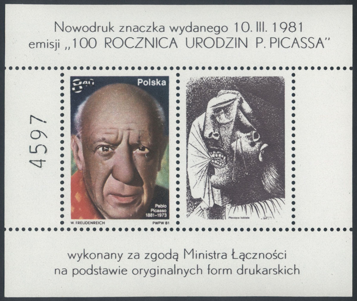 1981 Pablo Picasso, nowodruk. Gwarancja M. Wysocki | Fi.2580ND Mi.Bl.74ND |