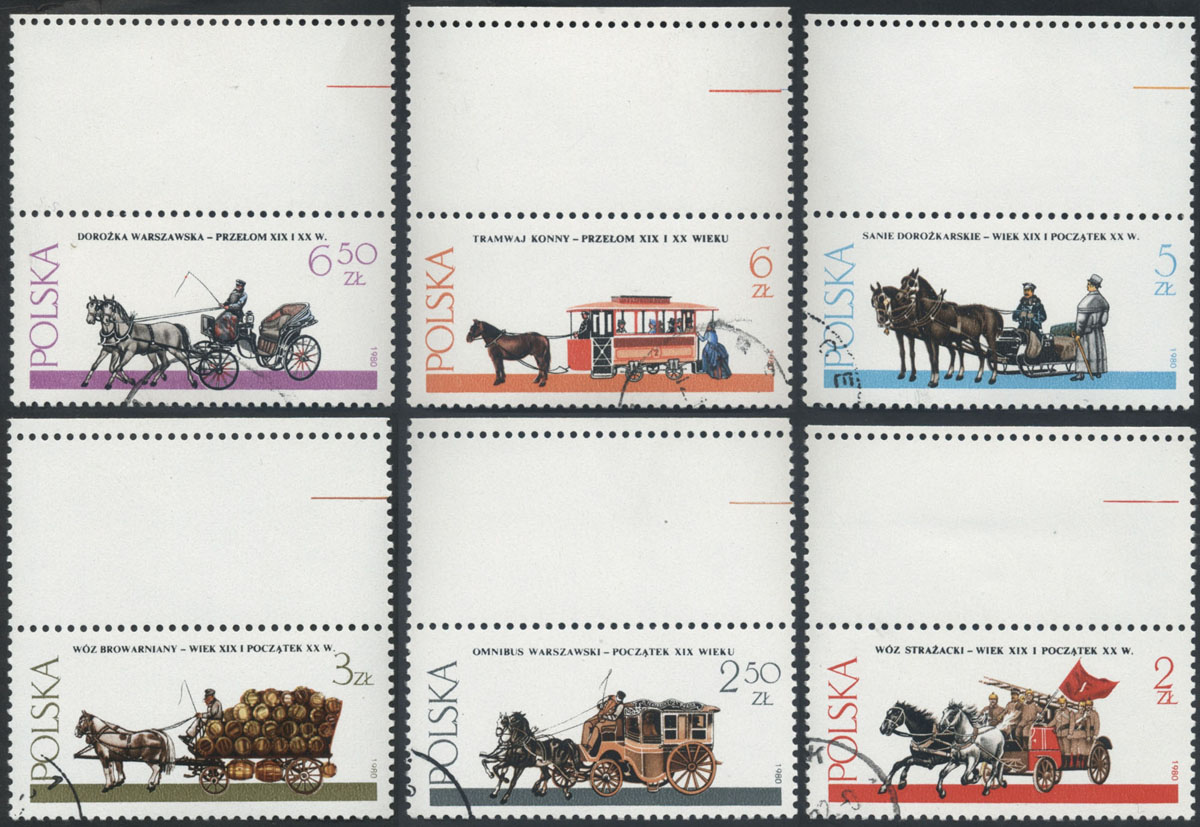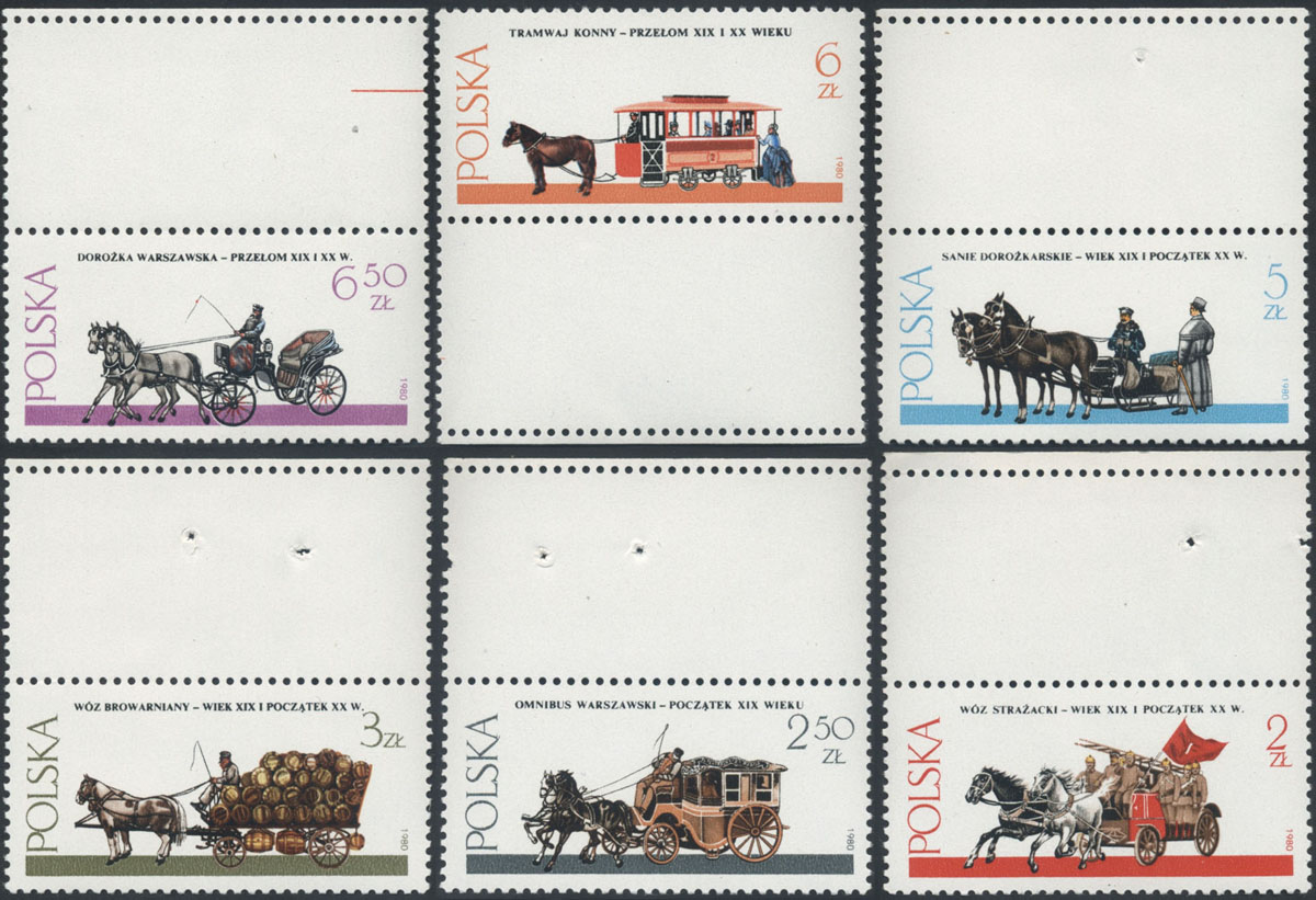 1980 Warszawskie pojazdy konne, seria z pustopolami u góry, z wyjątkiem znaczka za 6 zł z pustopolem u dołu (Fi.50.-). | Fi.2573-78 Mi.2721-26 |