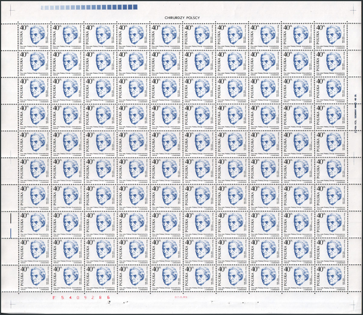 1989 chirurdzy polscy, arkusz znaczka za 40 zł złożony w połowie. | Fi.3073 ark. Mi.3221 |